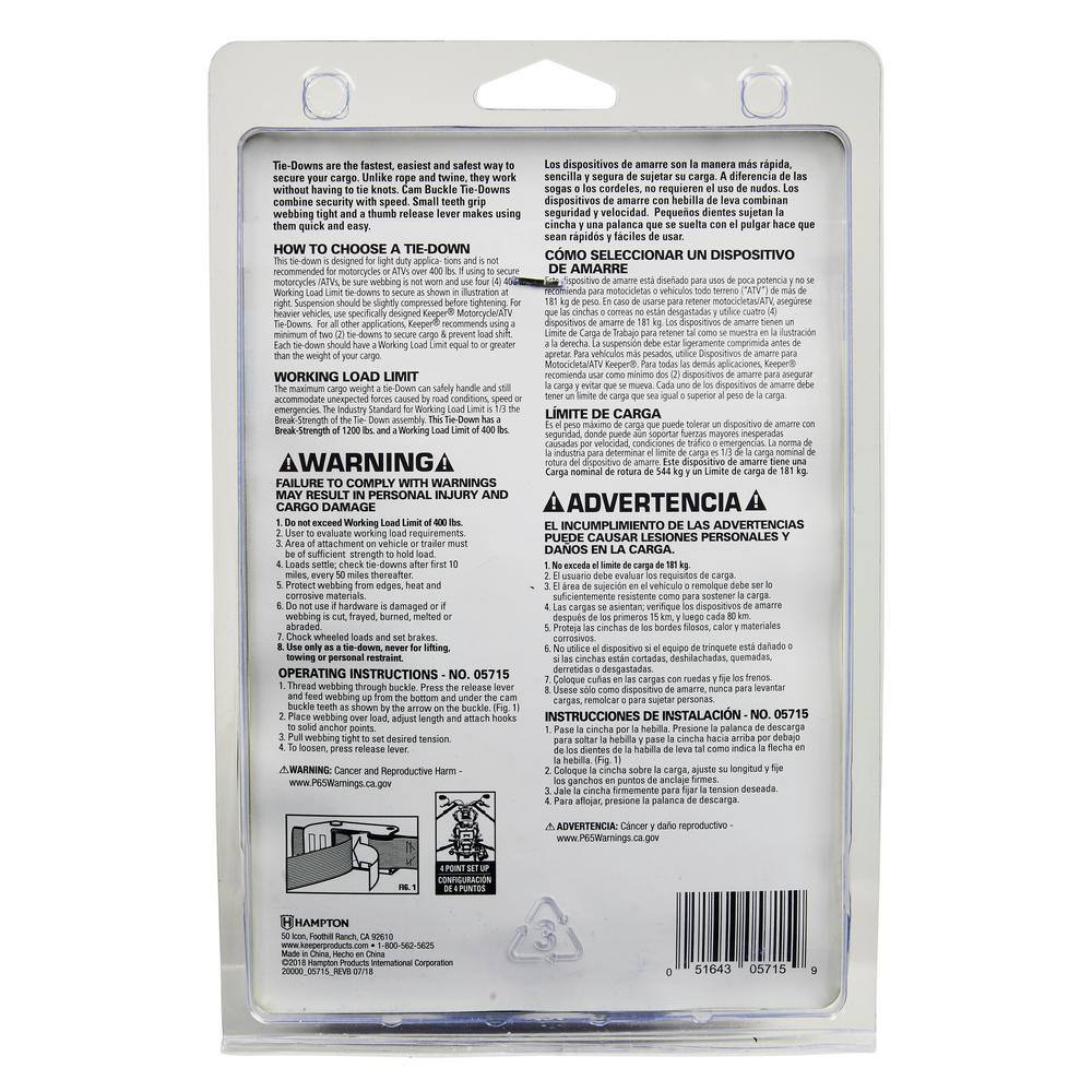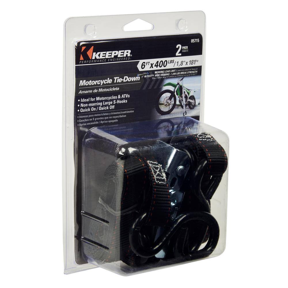 Keeper 1 in. x 6 ft. 400 lbs Motorcycle Cam Buckle Tie-Down, 2-Pack