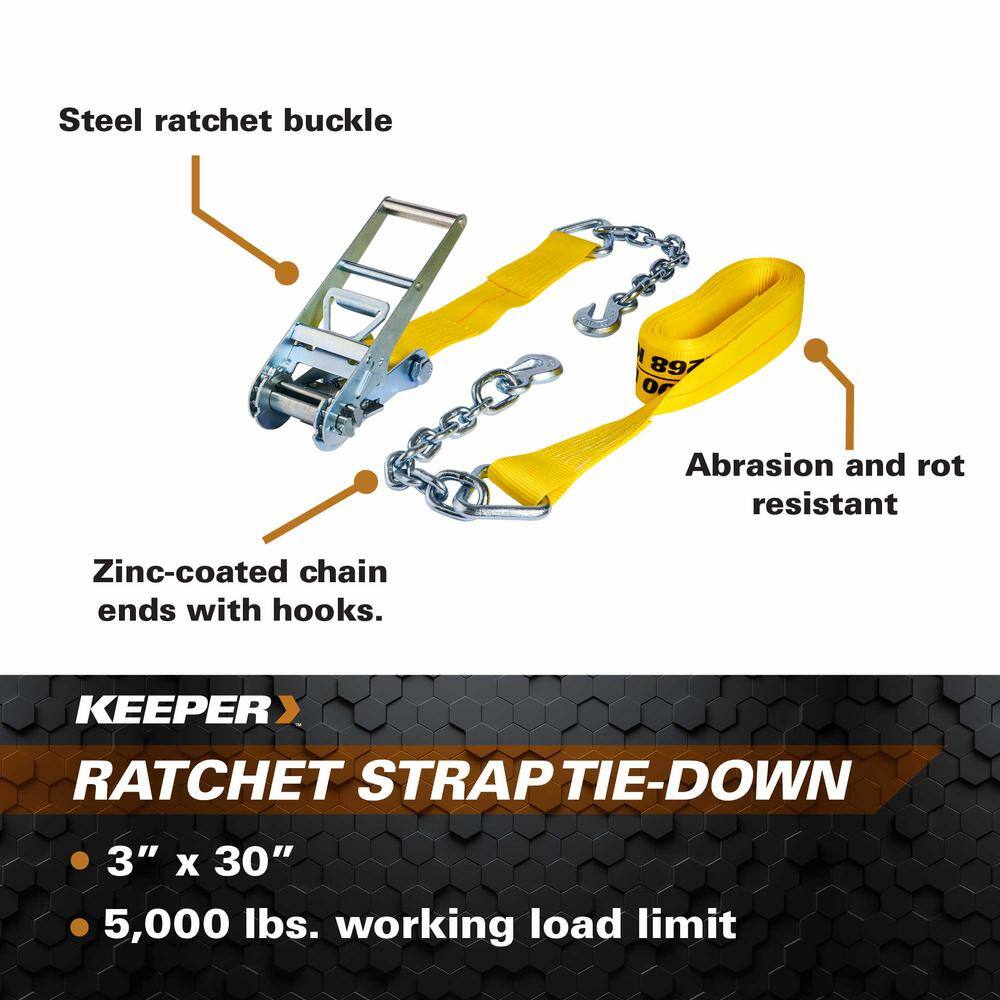 Keeper 30 ft. x 3 in. Ratchet Tie-Down with Chain Ends and Grab Hook, 5,000 lbs. WLL