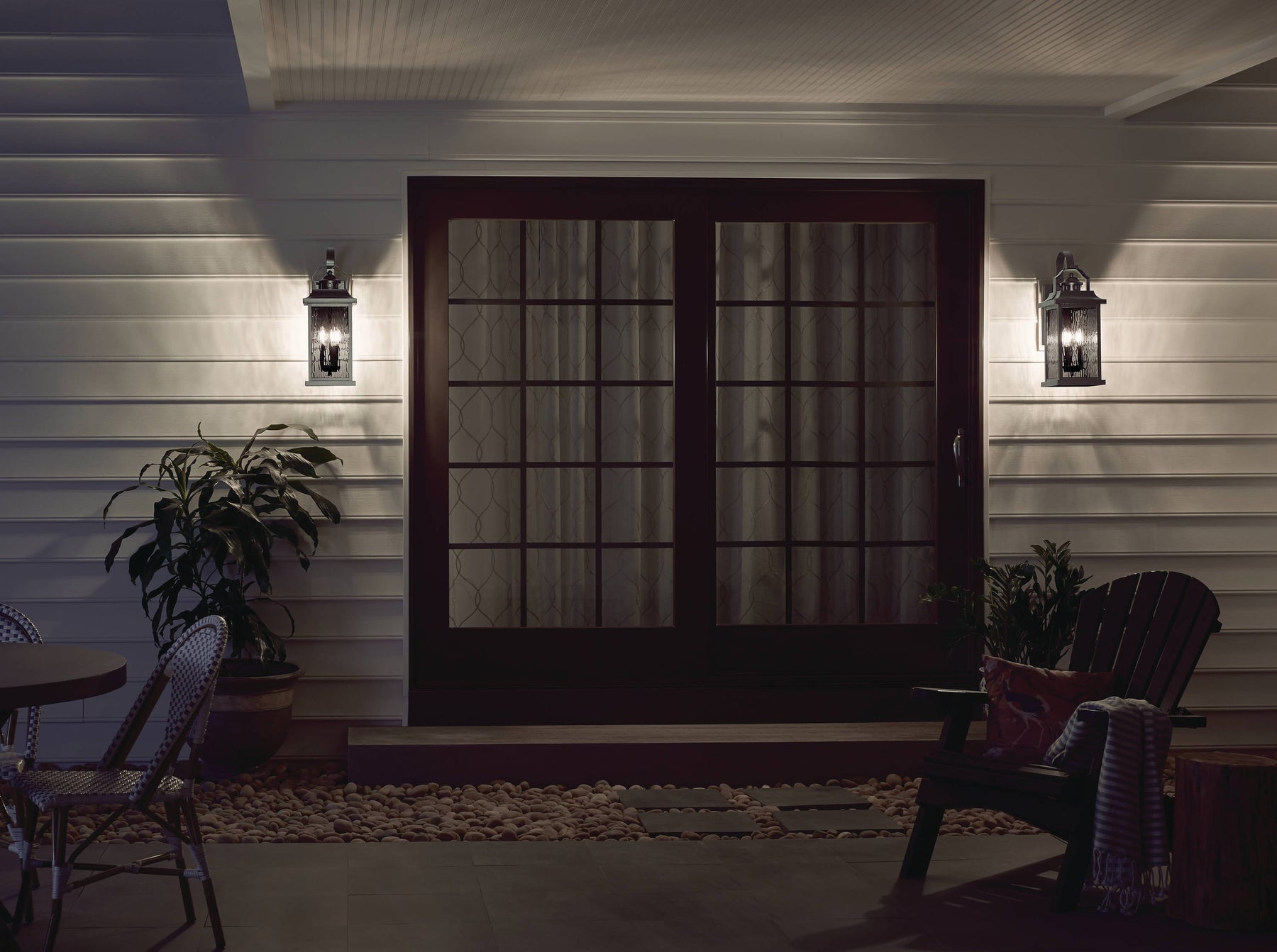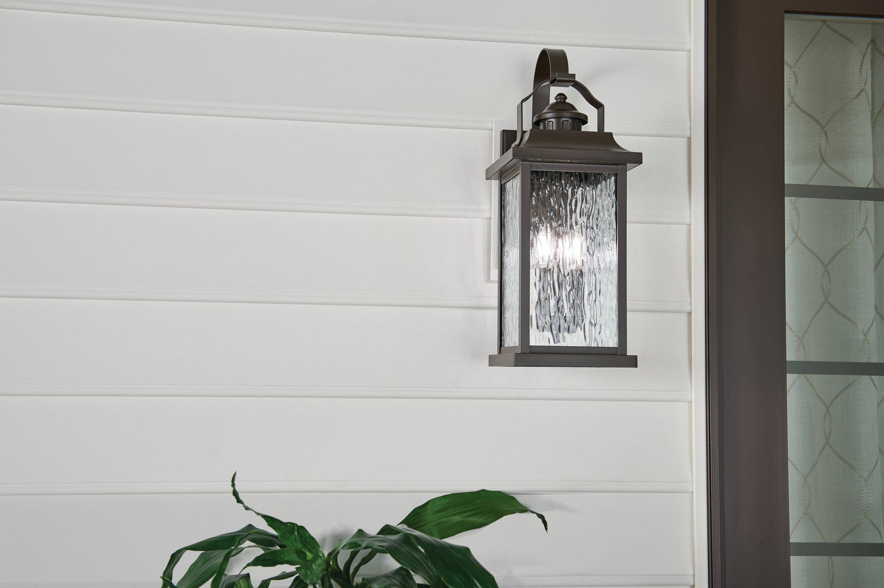 The Kichler Linford outdoor wall lantern pairs an Olde Bronze finish with clear wave glass for timeless curb appeal. Built from weather-resistant die-cast aluminum, it houses three candelabra-base bulbs to cast warm, ambient light across entryways and patios.