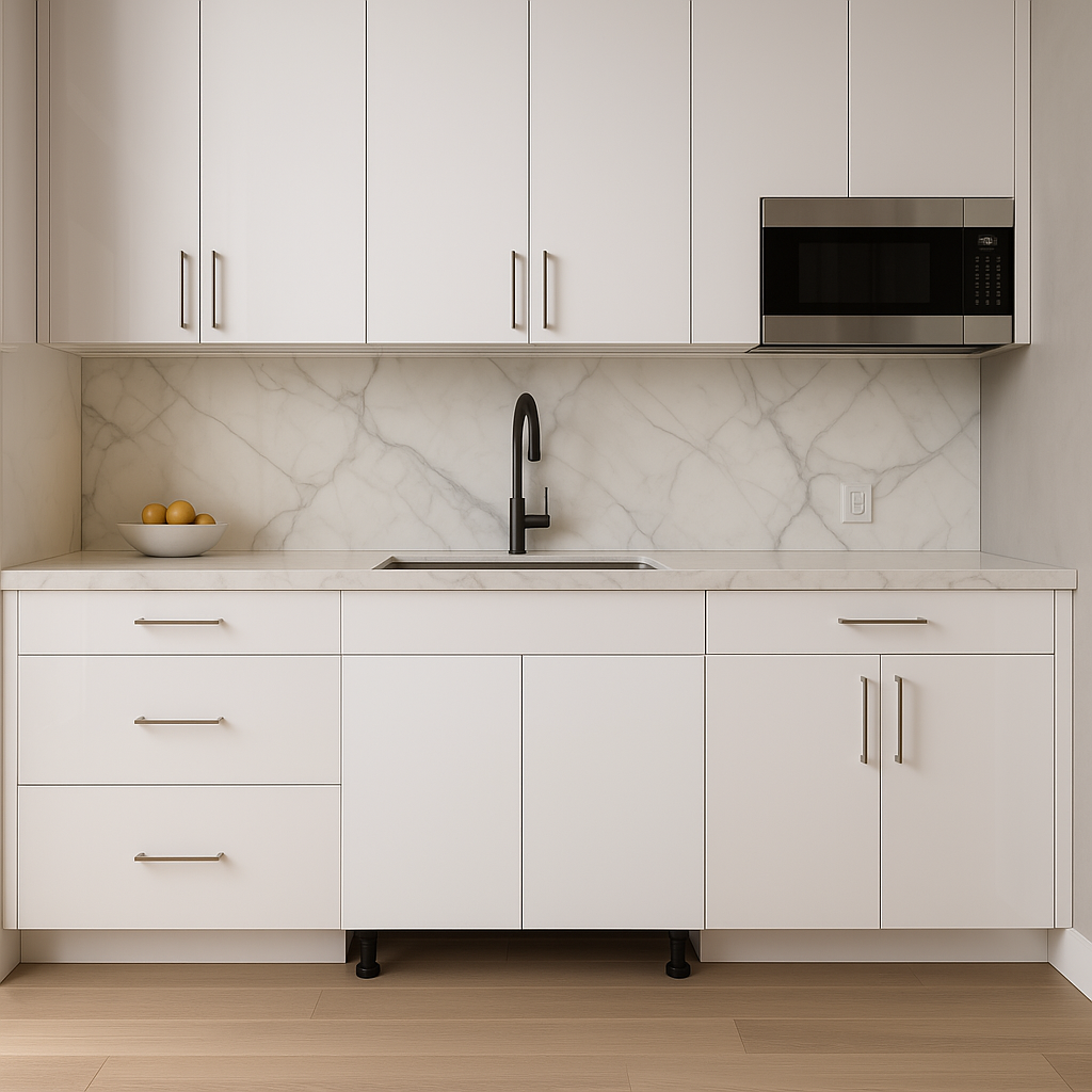 The Cambridge Radiance Sink Base Cabinet combines modern design with practical features, including soft-close doors and a durable white gloss finish. Its frameless construction and adjustable feet ensure easy installation and a sleek appearance.