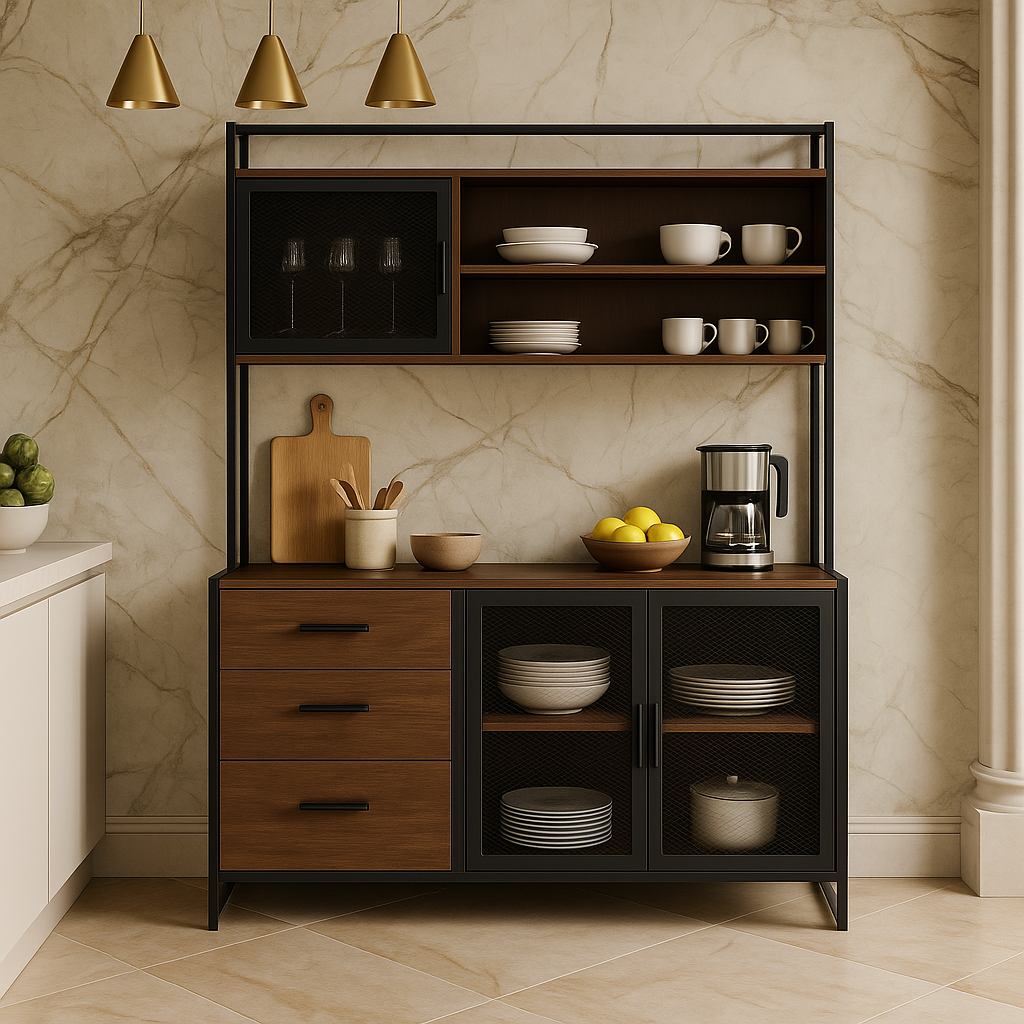 Transform your kitchen space with this beautifully crafted cabinet. The rich brown wood finish and metal mesh doors add a touch of rustic charm, while the multi-layer design ensures functionality and organization. Style it with vintage kitchenware or modern appliances to create a harmonious blend of tradition and contemporary flair. This cabinet is not just a storage solution; it's a statement piece for any home.