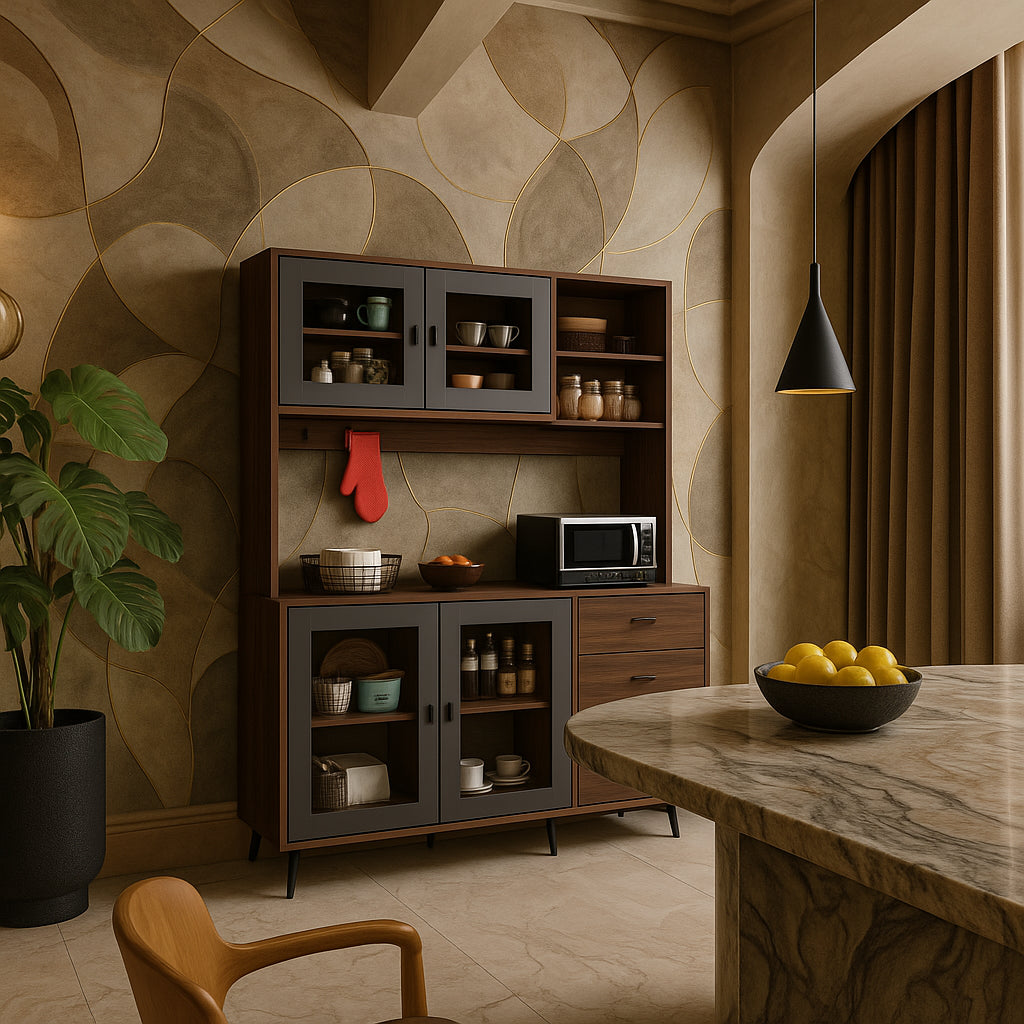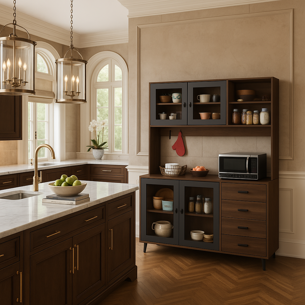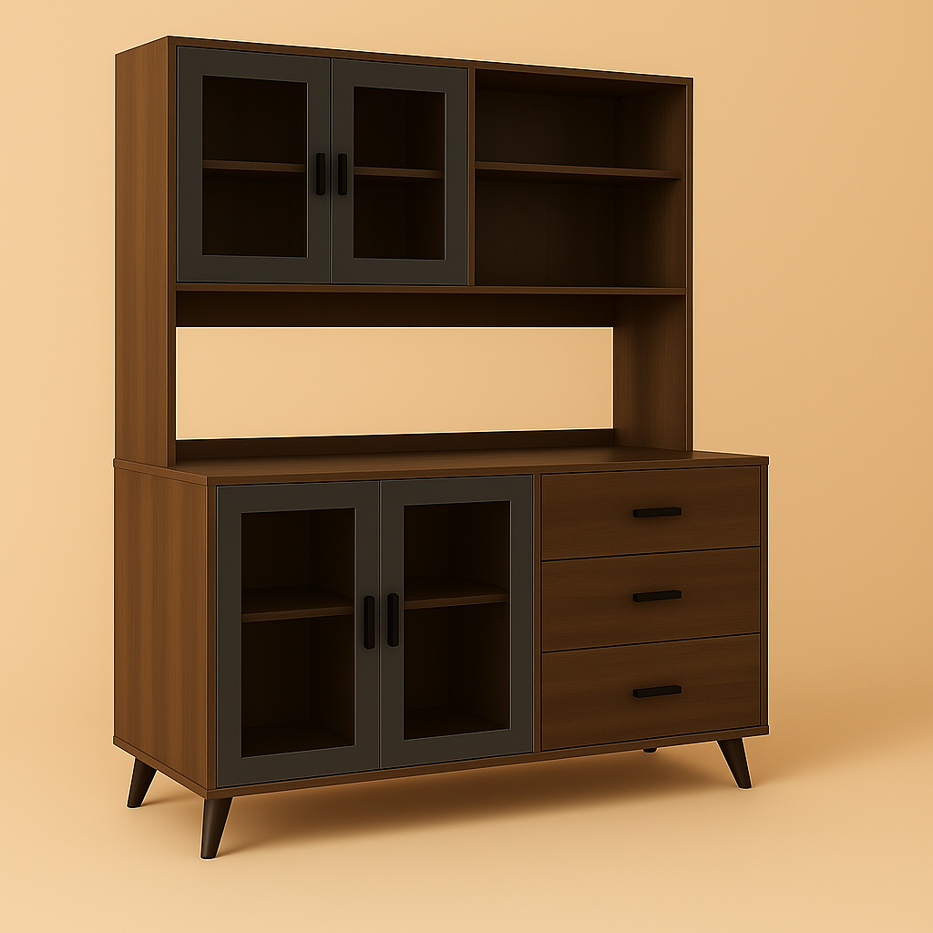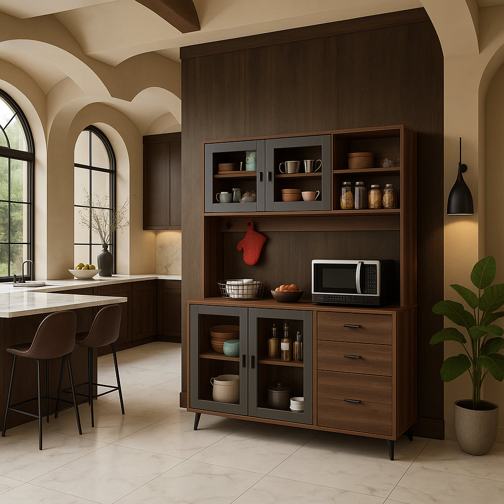 This elegant kitchen cabinet features a hutch with glass doors, multiple shelves, and drawers for ample storage. Made from durable MDF and solid metal, it combines functionality with style, perfect for organizing your kitchen essentials.