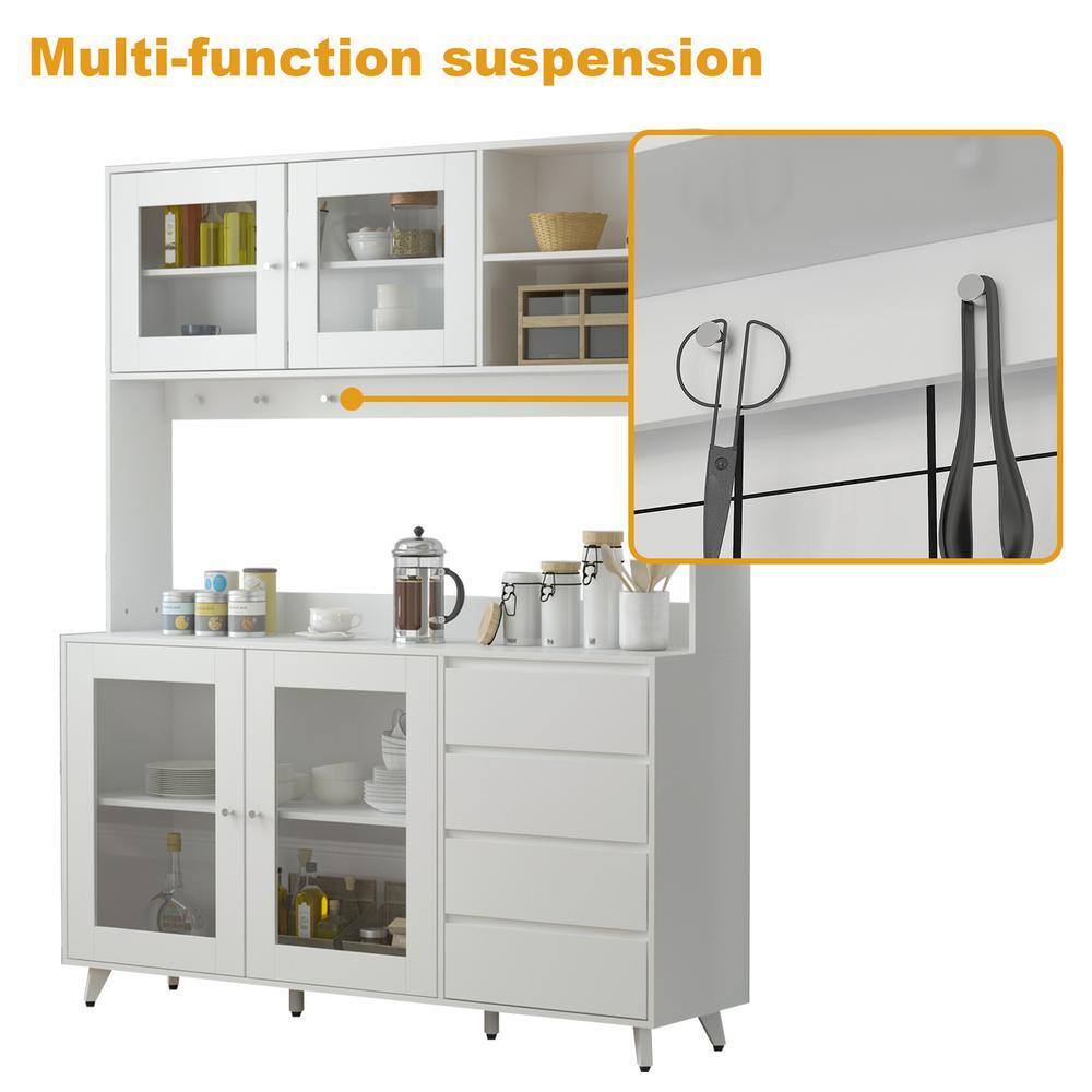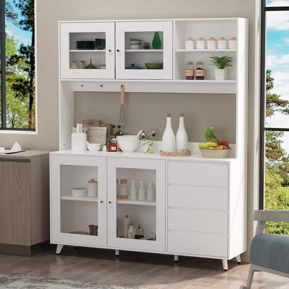 Glass Doors Large Pantry Kitchen Cabinet Buffet with 4-Drawers, Hooks, Open Shelves 74.8 in. H x 63 in. W x 15.7 in. D