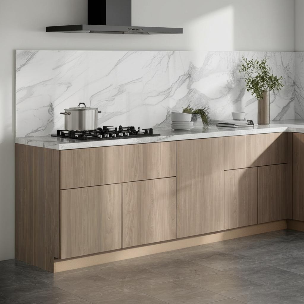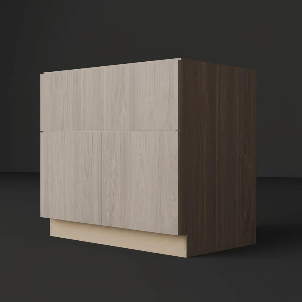 - Modern Aesthetic: Clean slab door style with a durable rigid thermofoil finish in an exotic wood-grain appearance.