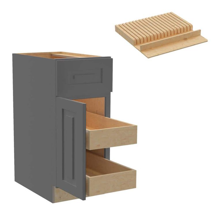 Bring organization and style to your kitchen with the Grayson Deep Onyx Base Kitchen Cabinet by Home Decorators Collection. Designed in a modern transitional shaker style, this cabinet features premium all-plywood construction and comes fully assembled. Experience the convenience of soft-close doors and drawers, along with a built-in 2ROT knife block for seamless culinary organization.