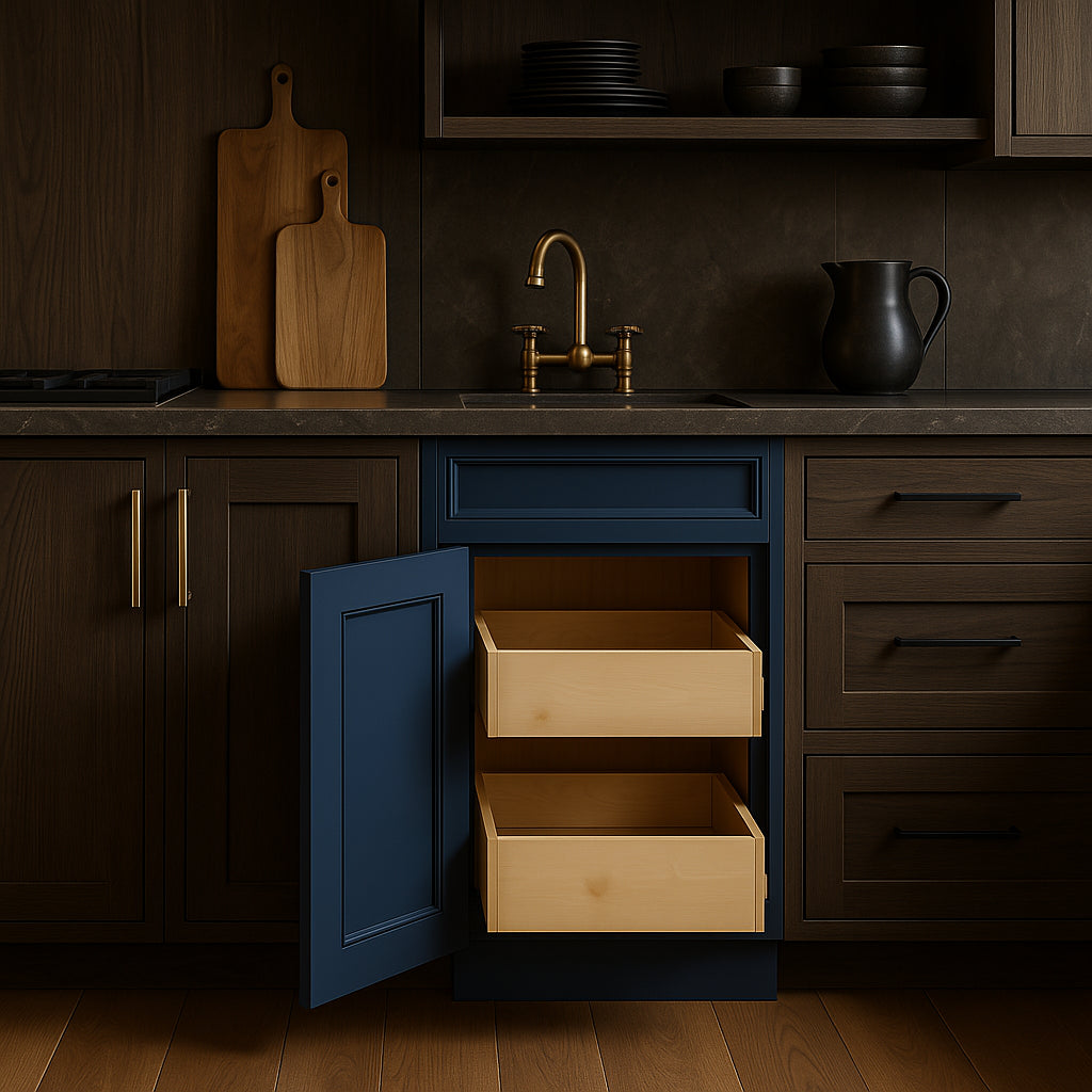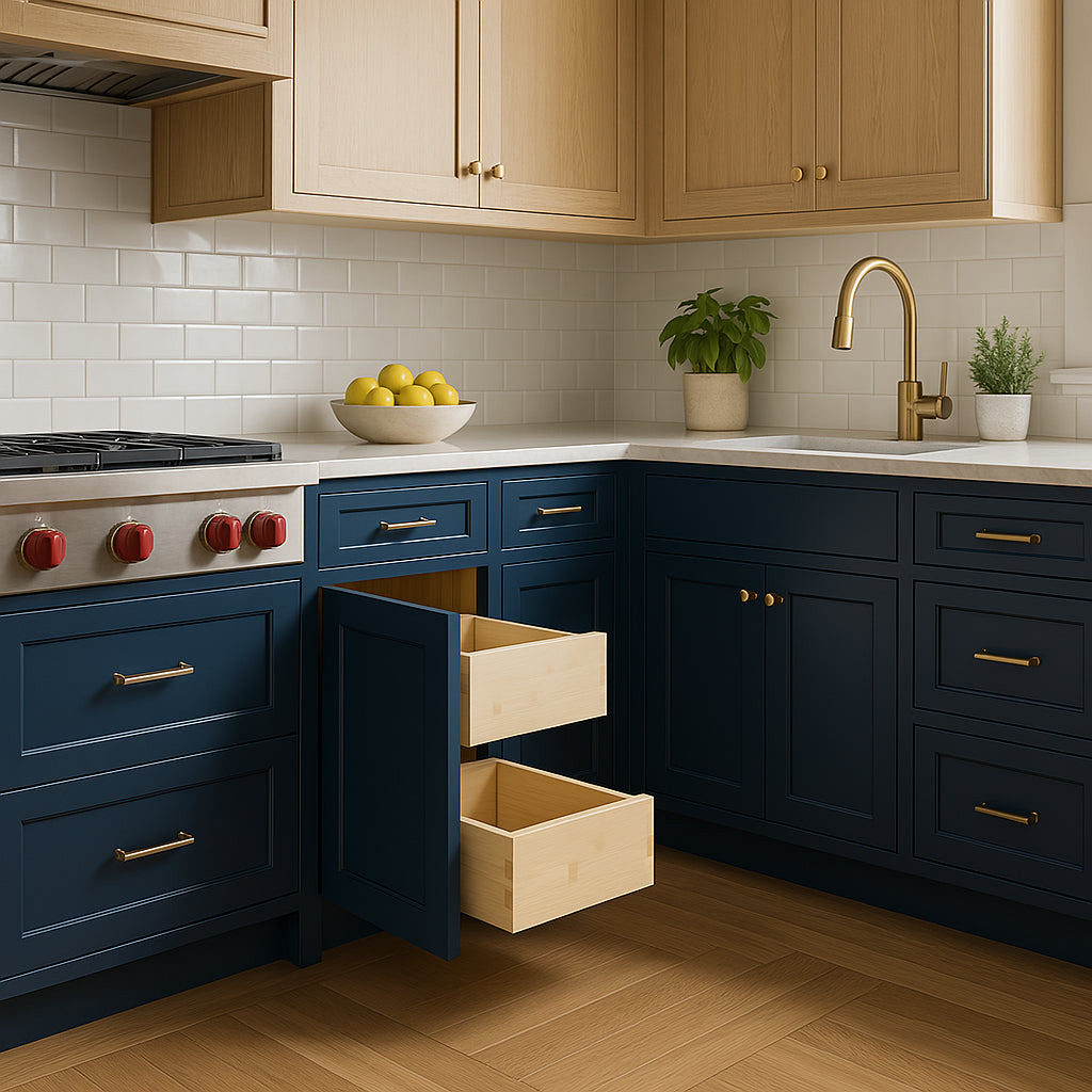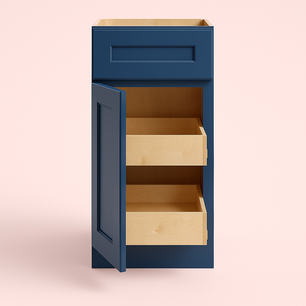 • Elegant Design: Shaker-style doors with flat recessed panels and a bold Mythic Blue finish.