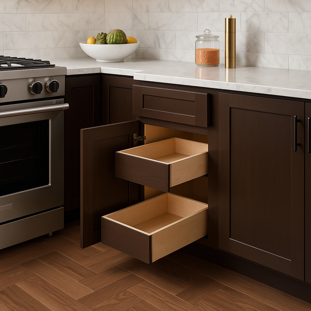 The Newport Manganite Base Kitchen Cabinet combines modern shaker-style design with durable CARB II compliant plywood construction. Featuring soft-close drawers and a rich manganite glaze finish, this cabinet offers both functionality and elegance.