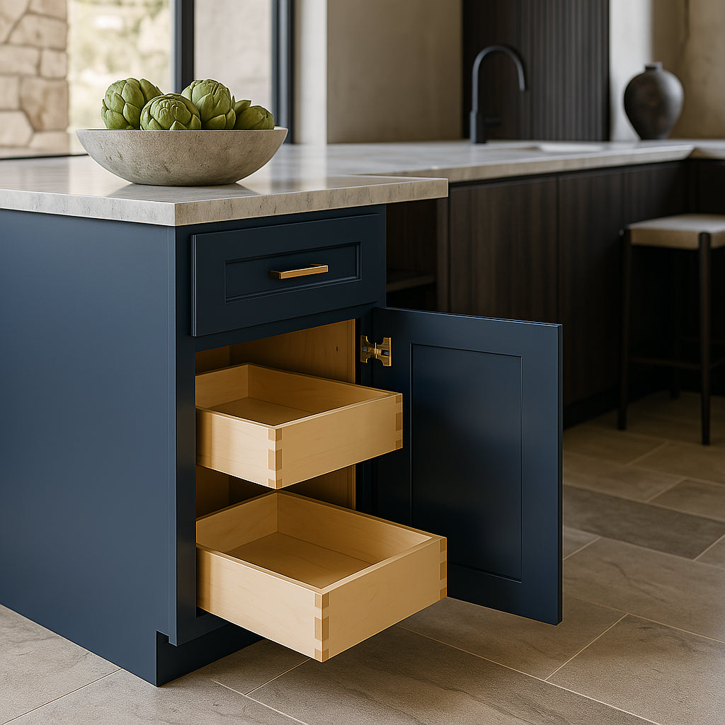 The Mythic Blue Kitchen Cabinet is a masterpiece of design and functionality, bringing a bold yet timeless charm to your kitchen. Its Shaker-style doors and drawers, paired with the rich Mythic Blue finish, create a striking visual impact that complements both modern and traditional interiors. Style it with brushed nickel hardware for a sophisticated touch or pair it with light countertops to highlight its vibrant hue. This cabinet is not just a storage solution but a statement piece that elevates your culinary space to new heights of elegance.