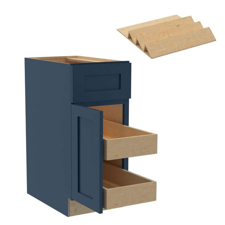 The Mythic Blue Kitchen Cabinet from Home Decorators Collection is a beautifully crafted storage solution, featuring a durable plywood construction. Its mythic blue finish with shaker-style design offers both a classic and bold aesthetic, while the soft-close roll-out trays and spice tray insert provide functional, organized storage. Ideal for enhancing the elegance and utility of any kitchen setting.