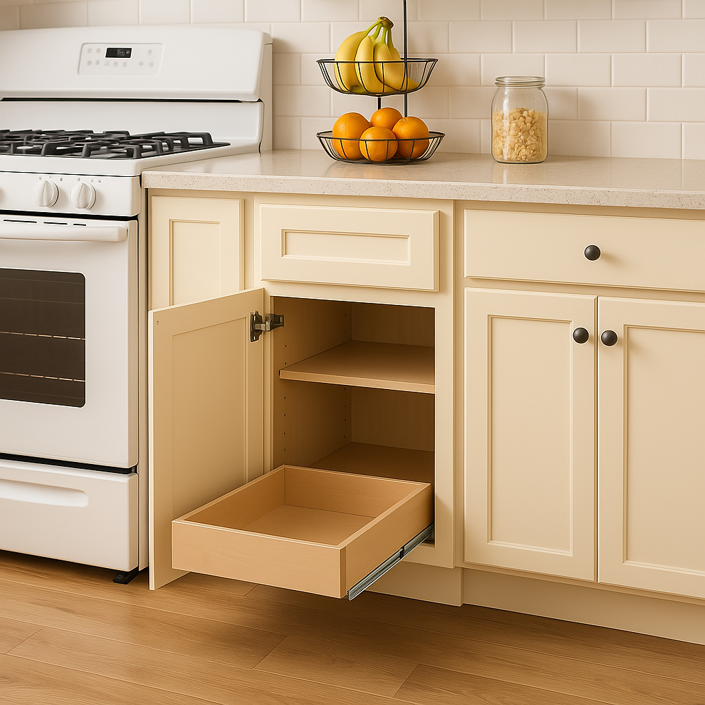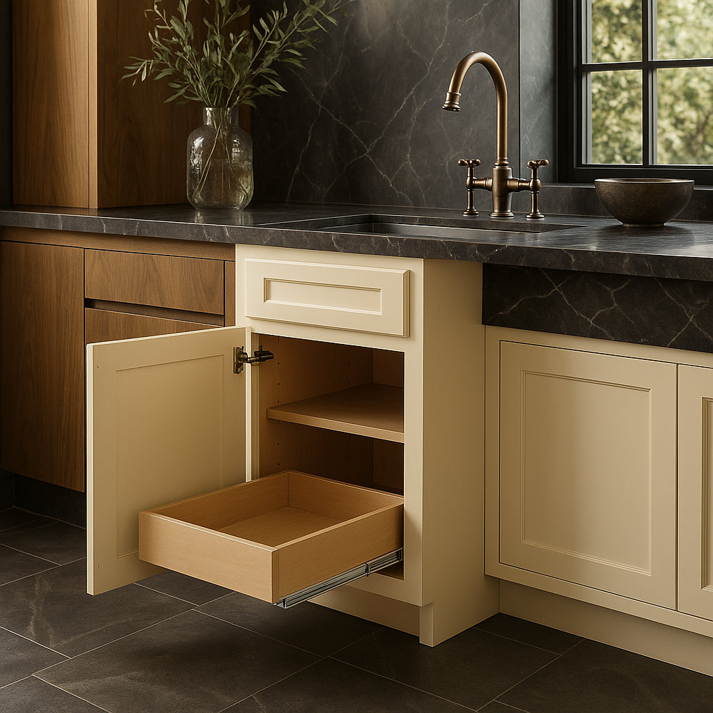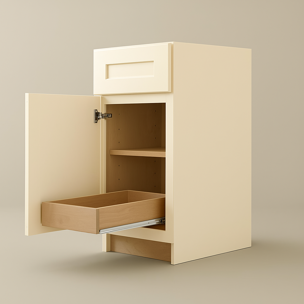 The Newport Plywood Base Kitchen Cabinet combines durable all-plywood construction with a soft Blended Cream finish, offering timeless shaker-style design and practical features like soft-close mechanisms and adjustable shelves.