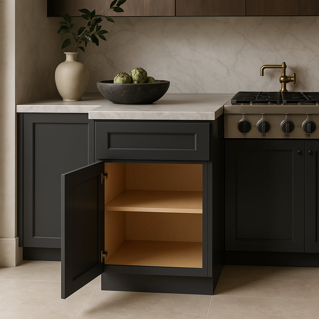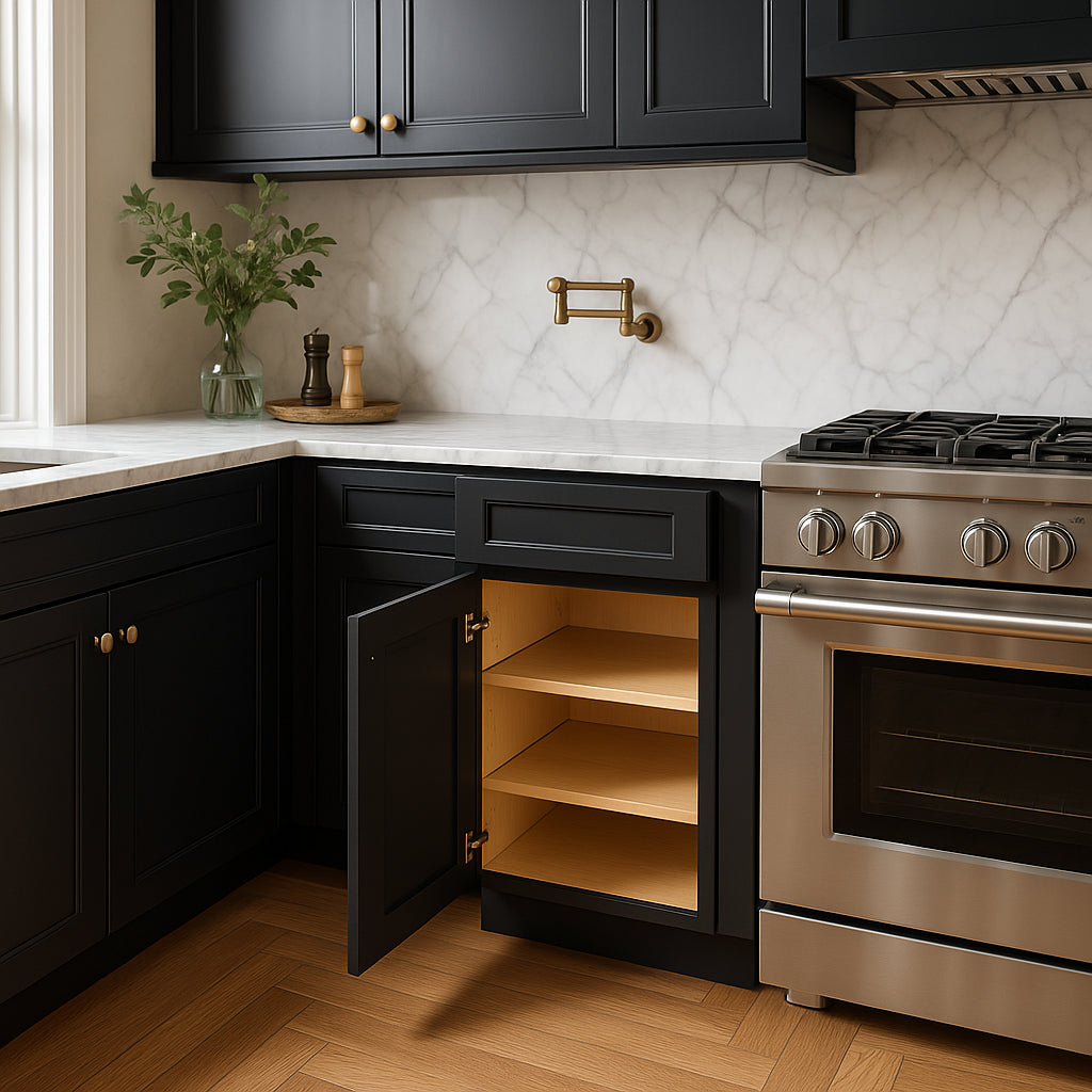 The Newport Deep Onyx kitchen cabinet combines durable all-plywood construction with a bold, modern finish. Featuring soft-close doors and drawers, adjustable shelves, and dovetail joints, it offers both style and functionality for any kitchen.