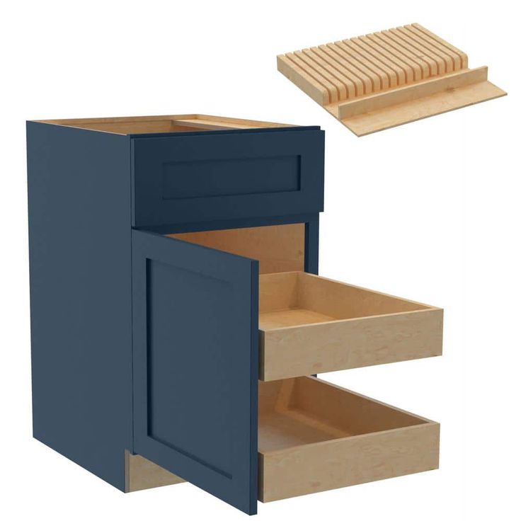 Elevate your kitchen with the Home Decorators Collection's Newport Plywood Base Kitchen Cabinet, featuring a stunning Mythic Blue finish. This cabinet combines classic Shaker style with modern convenience, including soft-close doors and drawers, and a built-in knife block for ultimate organization.