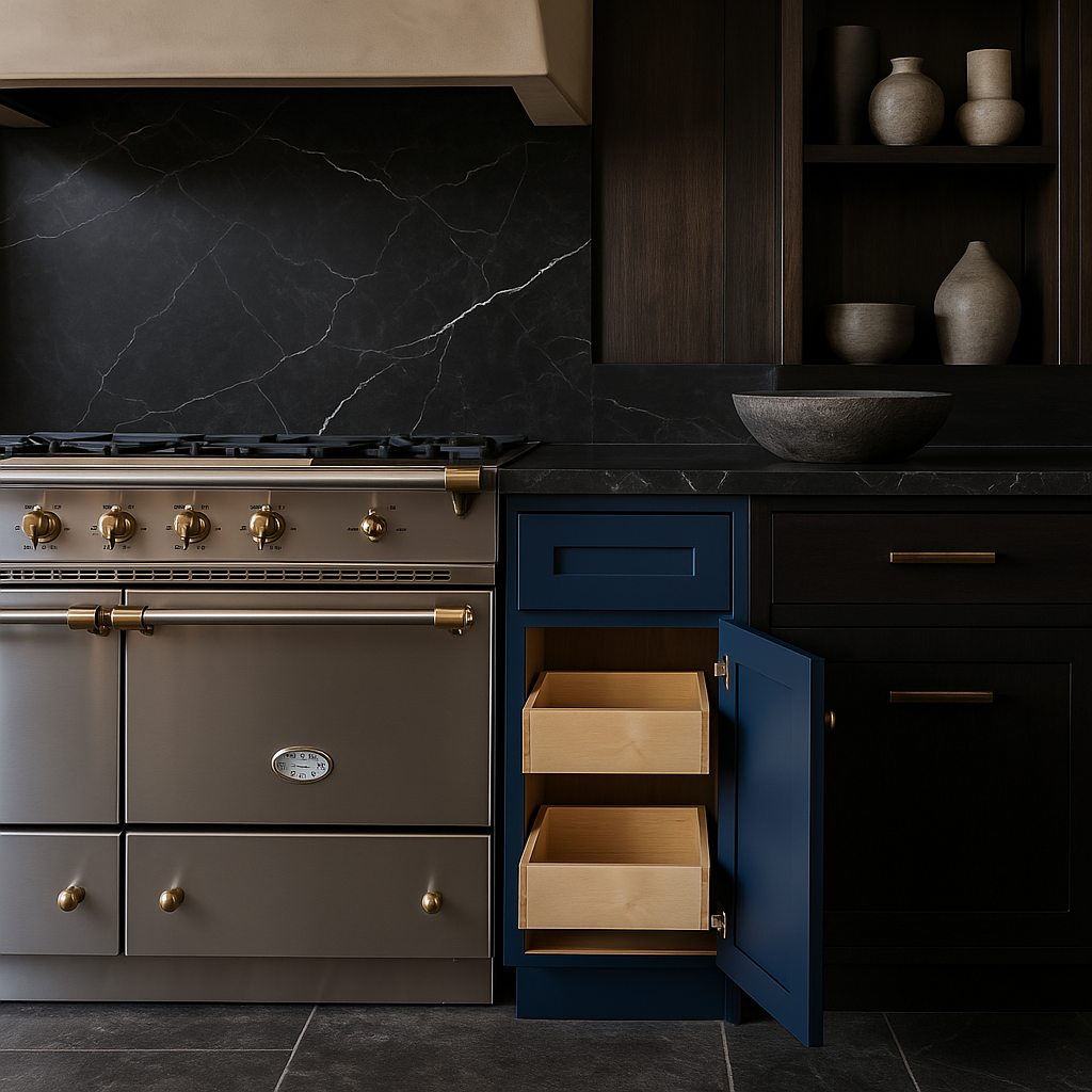 Transform your kitchen with the Mythic Blue cabinet and experience the perfect blend of style and functionality.