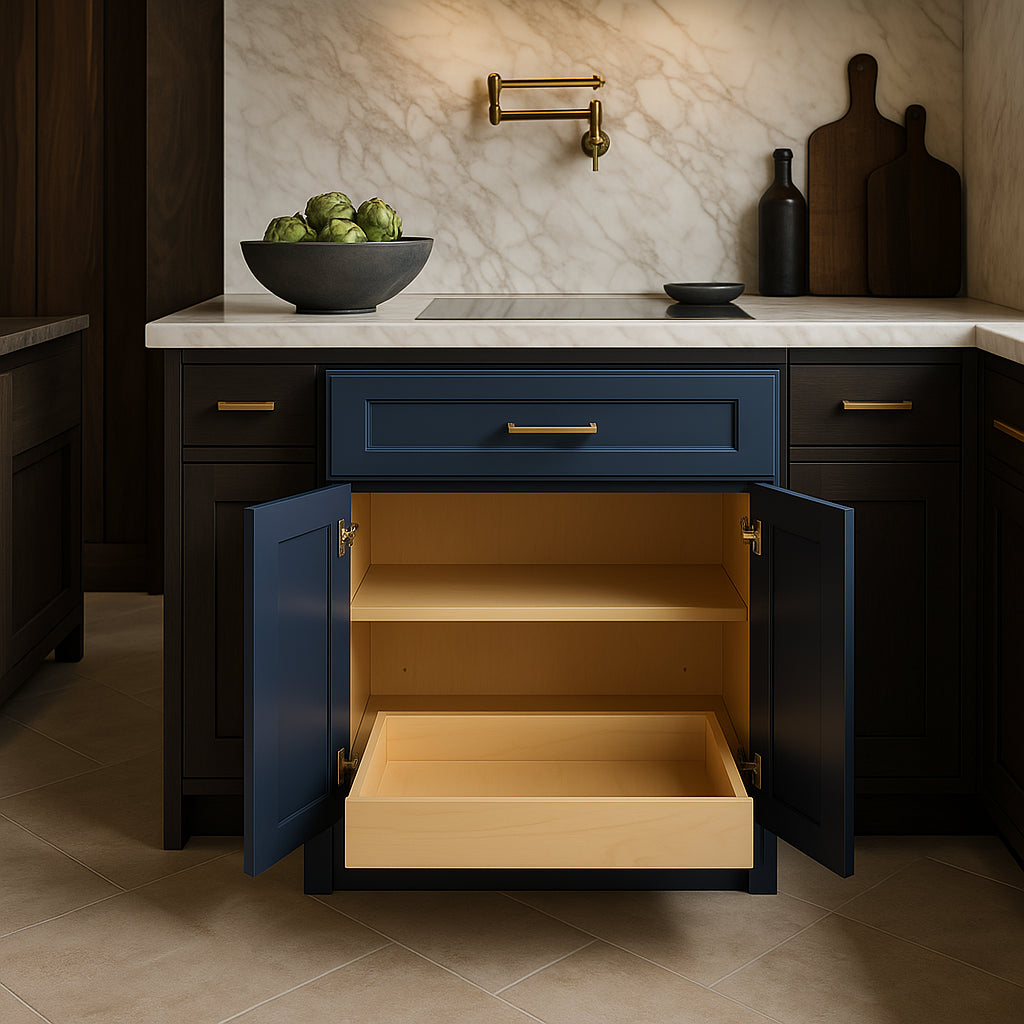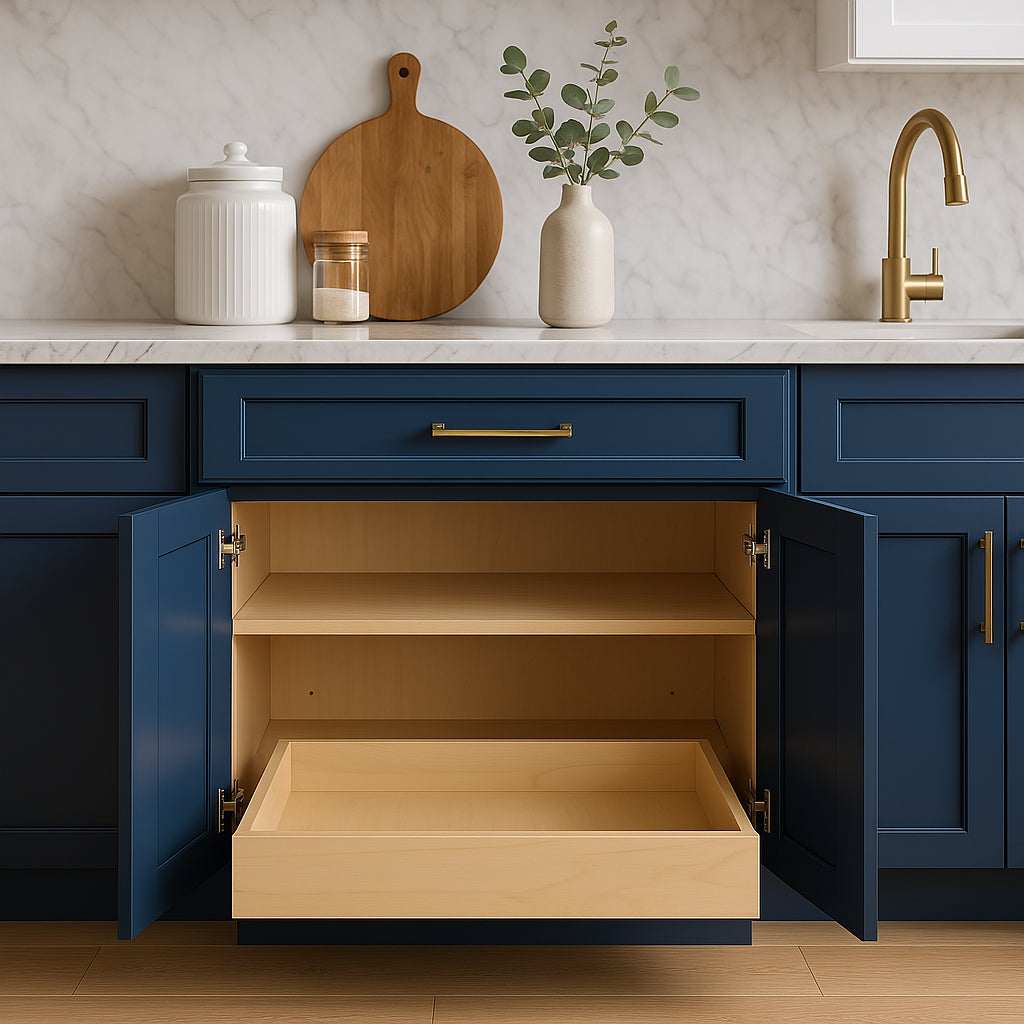 - Elegant Design: Shaker-inspired doors with 3" wide frames in a bold Mythic Blue finish.