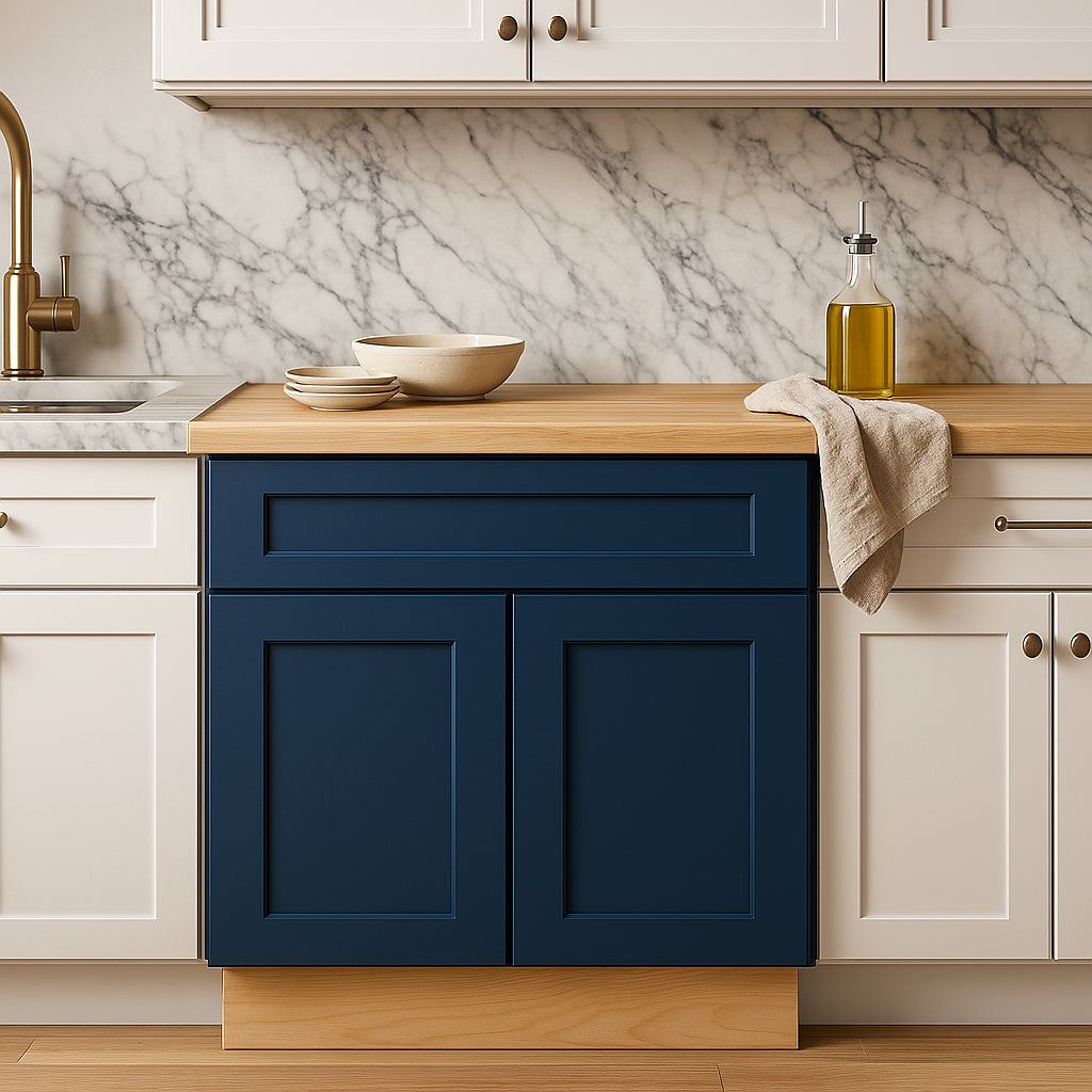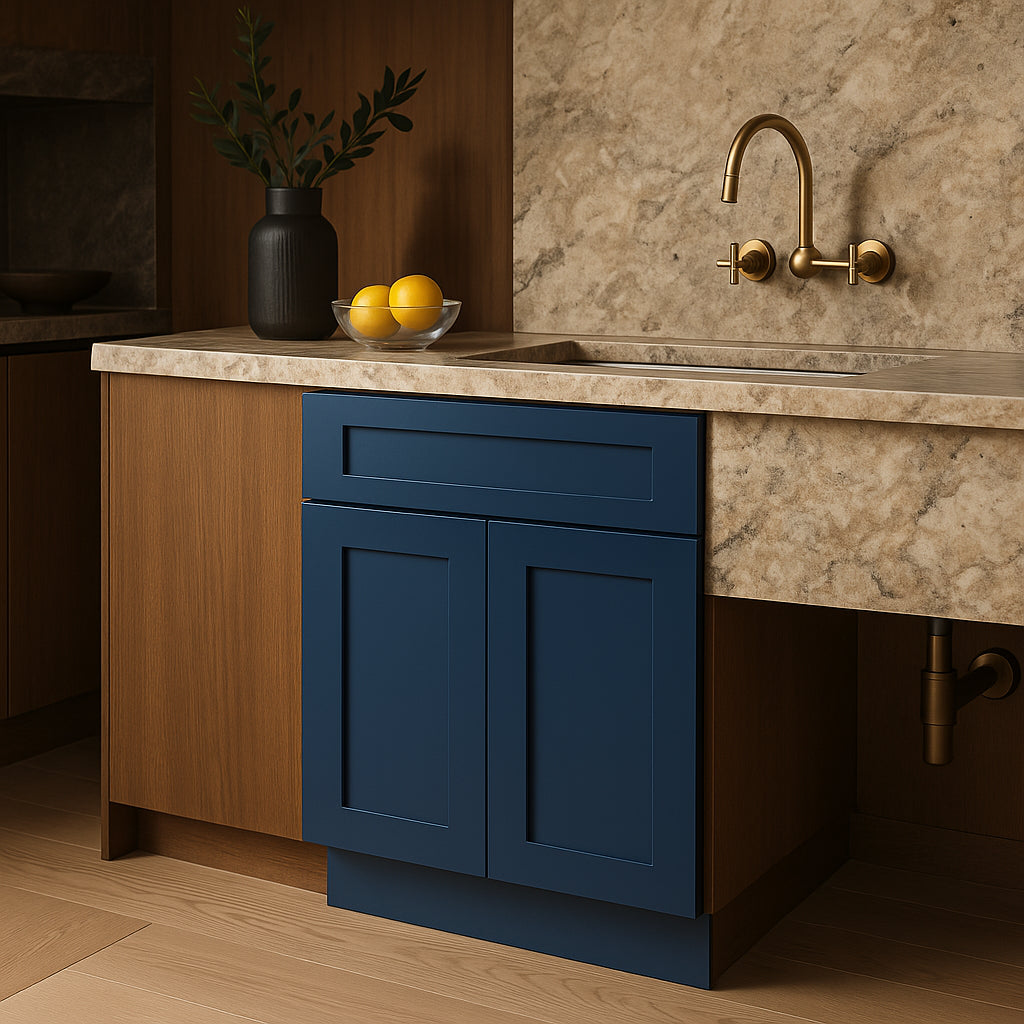• Bold Design: Shaker-inspired doors with a multi-step painted finish in Mythic Blue.