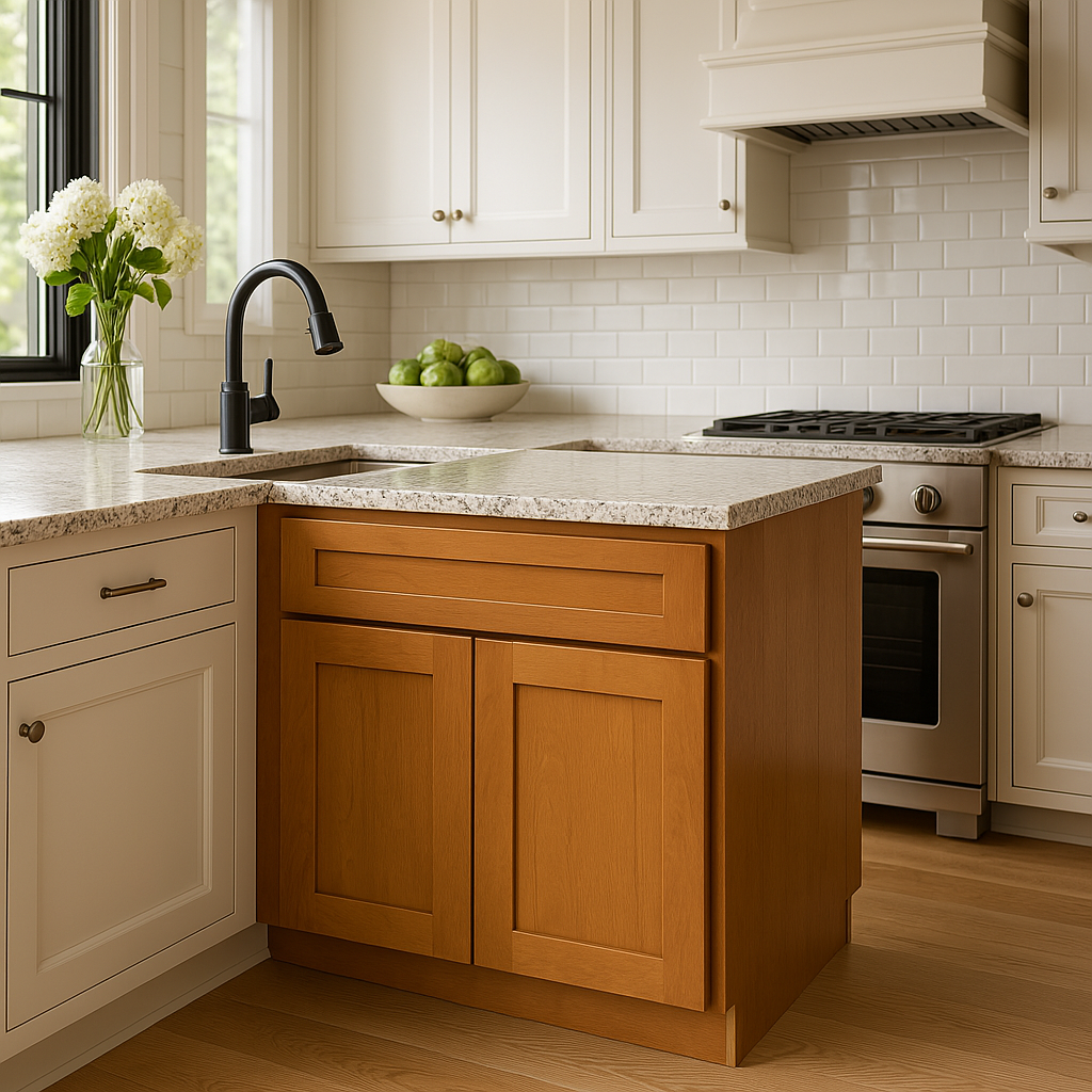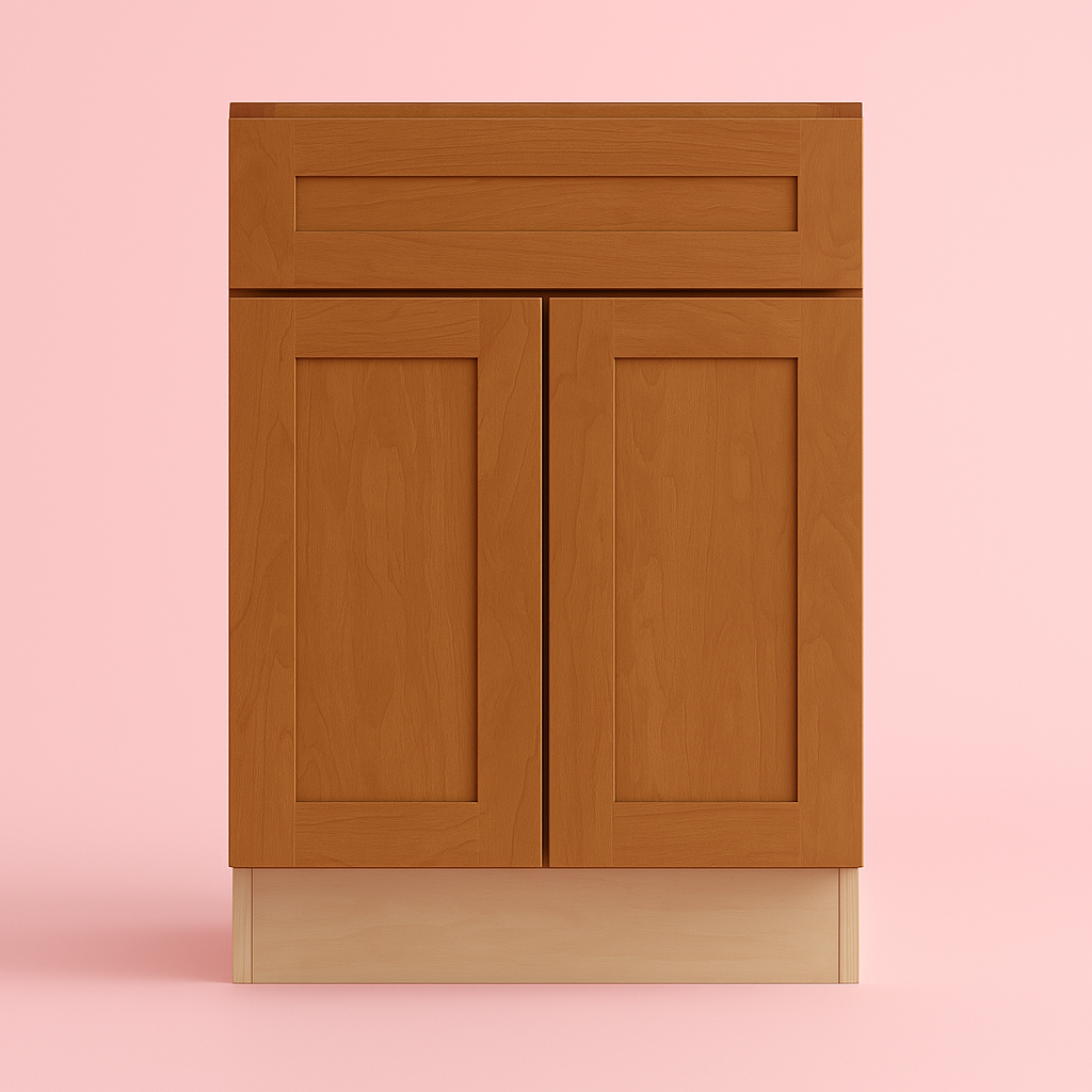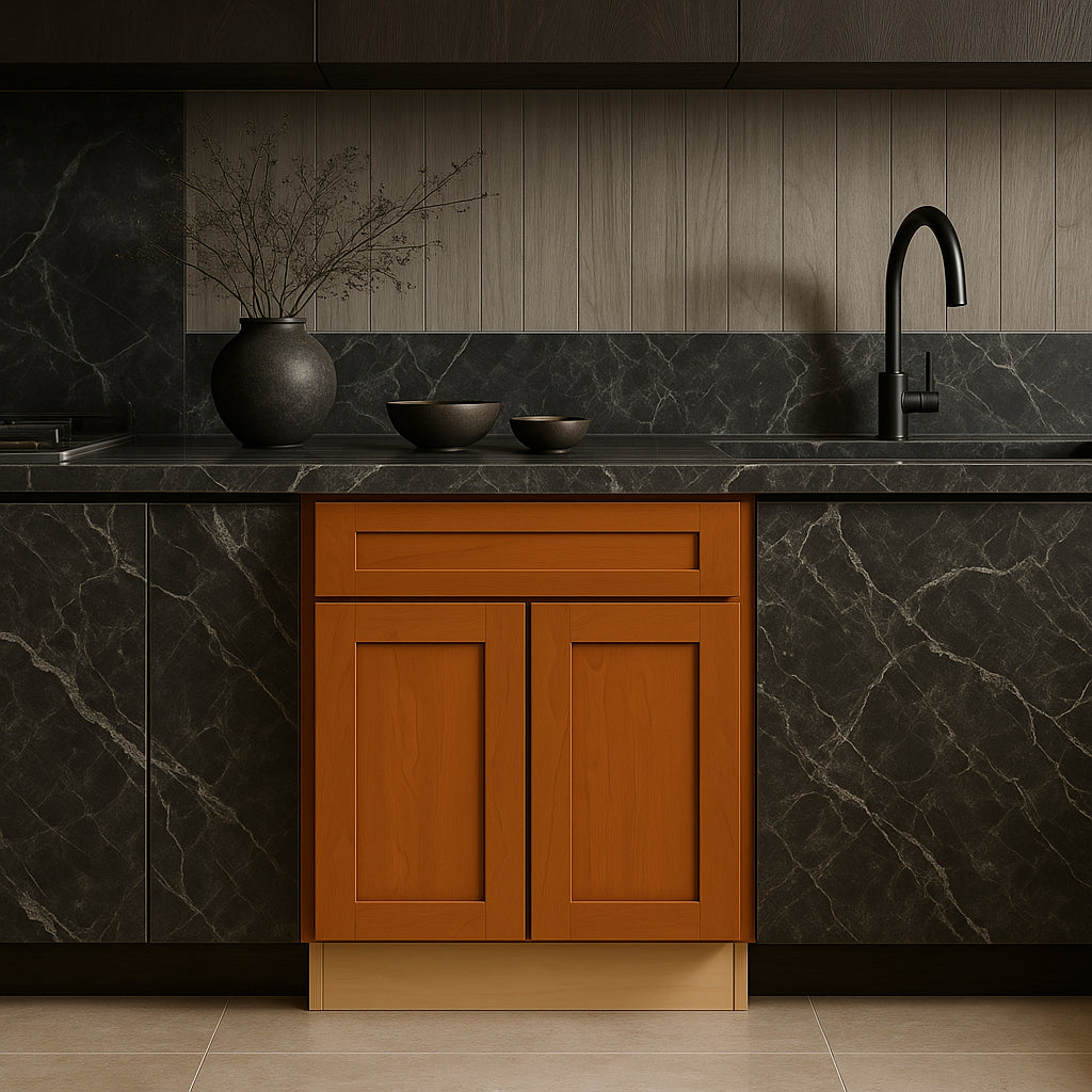 - Stylish Design: Shaker-style doors with a warm cinnamon finish highlight the natural wood grain.