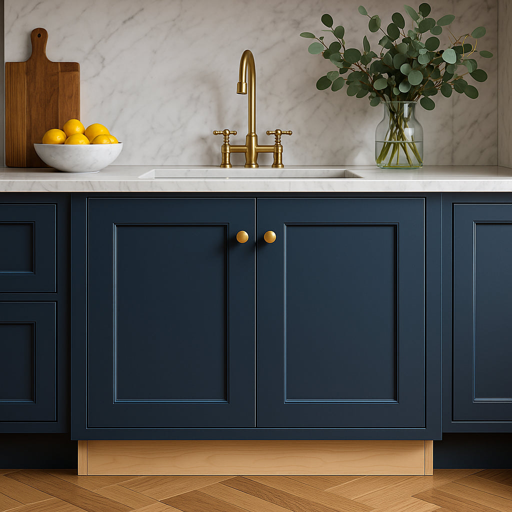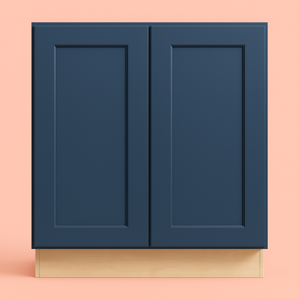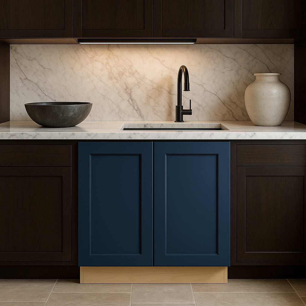 The mythic blue finish of this kitchen cabinet instantly transforms a space into a sophisticated haven. Its Shaker-inspired geometric design invites modern sensibility with a classic twist. Try pairing these cabinets with gold hardware to highlight the luxurious tones of the blue. These cabinets aren't just functional; they're an artwork that elevates the very heart of your home, making culinary exploration as delightful as the kitchen that houses it.