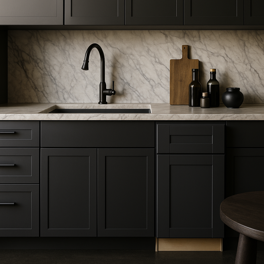 Imagine your kitchen transformed with the striking presence of this onyx base cabinet. Its bold visage not only captivates with a sophisticated allure but also serves as a practical storage jewel in your culinary design. Embrace its exquisite dovetail drawer craftsmanship as a testament to both beauty and utility. Style this masterpiece with metallic accents or modern hardware to elevate its dramatic impact, making it an indispensable piece for luxurious living.
