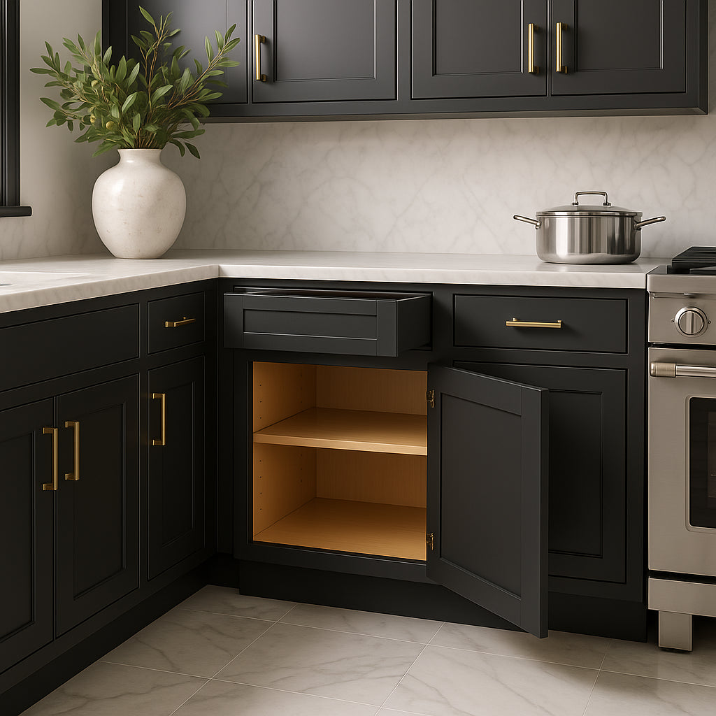 The Washington Onyx Base Kitchen Cabinet combines timeless design with modern convenience, featuring a bold onyx finish, soft-close doors, and durable plywood construction. Perfect for enhancing any kitchen space.