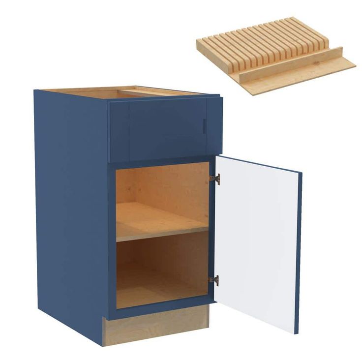 Transform your kitchen with the Washington Vessel Blue Shaker Base Kitchen Cabinet from Home Decorators Collection. Featuring a striking blue vinyl finish and durable CARB II compliant plywood construction, this cabinet combines style and functionality, complete with soft close mechanisms and a unique right-hand knife block.