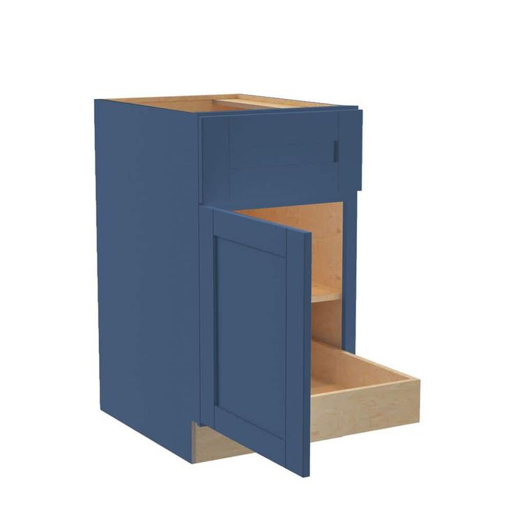 The Washington Vessel Blue Shaker Cabinet from Home Decorators Collection offers striking aesthetics with its deep blue hue and modern Shaker design. Constructed from CARB II compliant plywood, it features soft close doors and a durable vinyl finish, combining elegance with practicality for any kitchen setting.