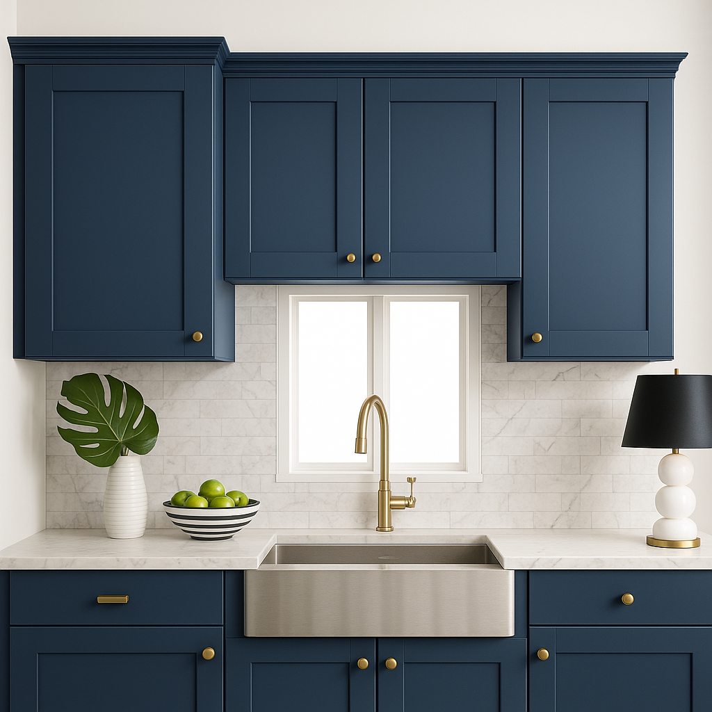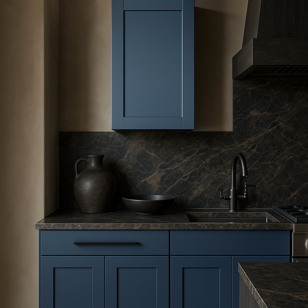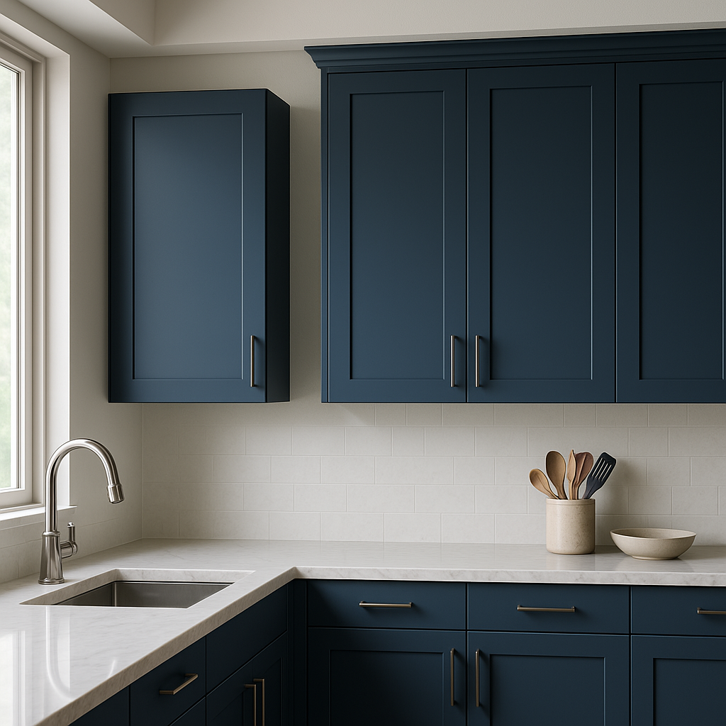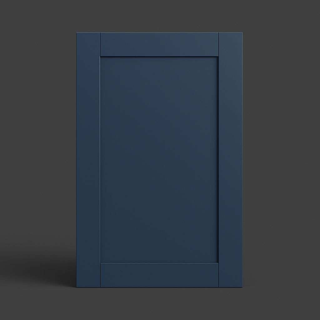- Elegant Design: Deep blue thermofoil finish with shaker-style doors.