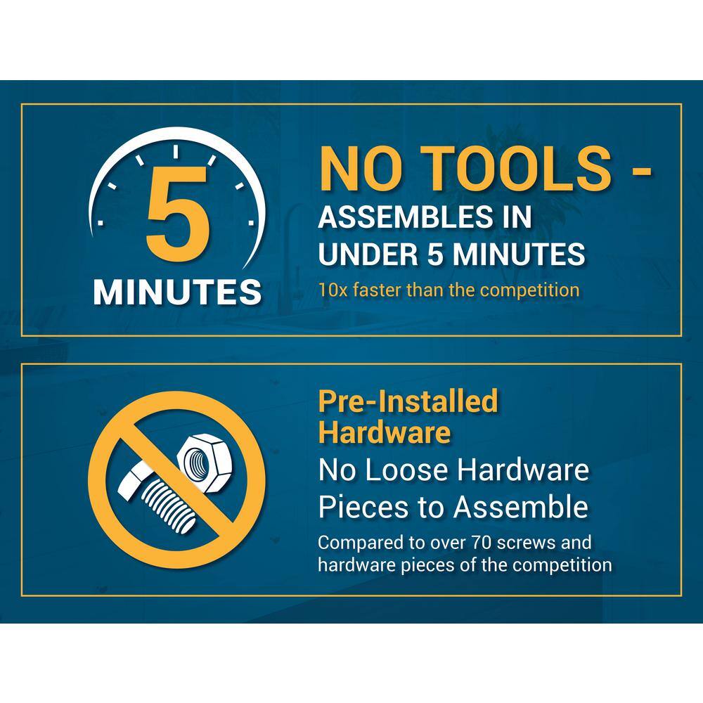 • Tool-Free Assembly: Patented pre-installed hardware allows for quick, screwdriver-free setup.