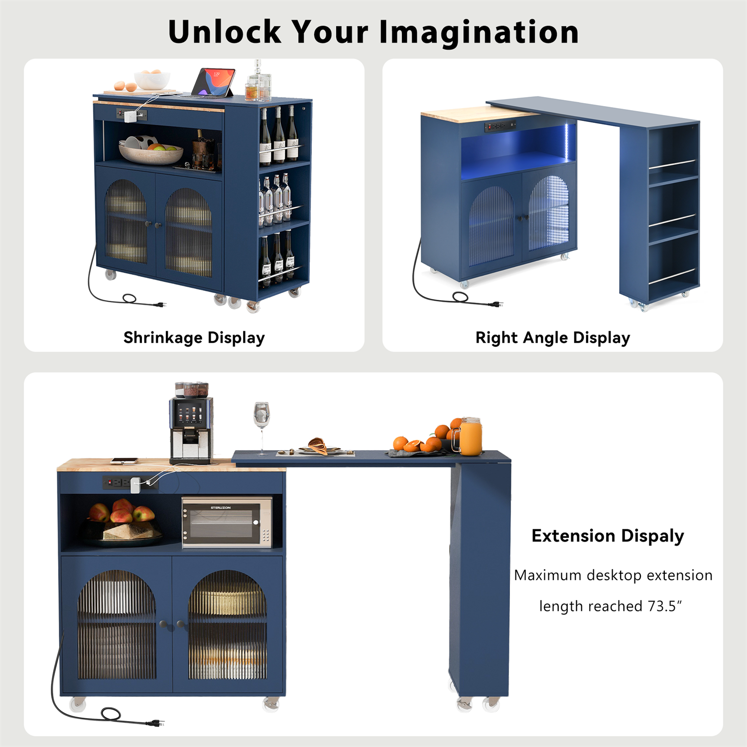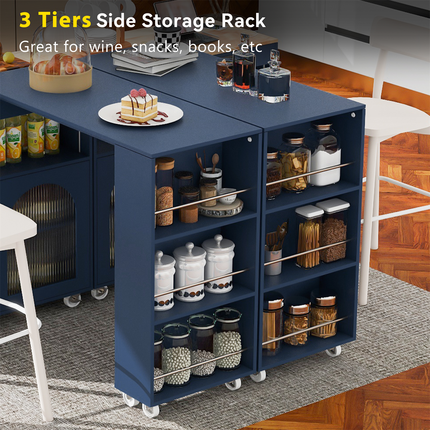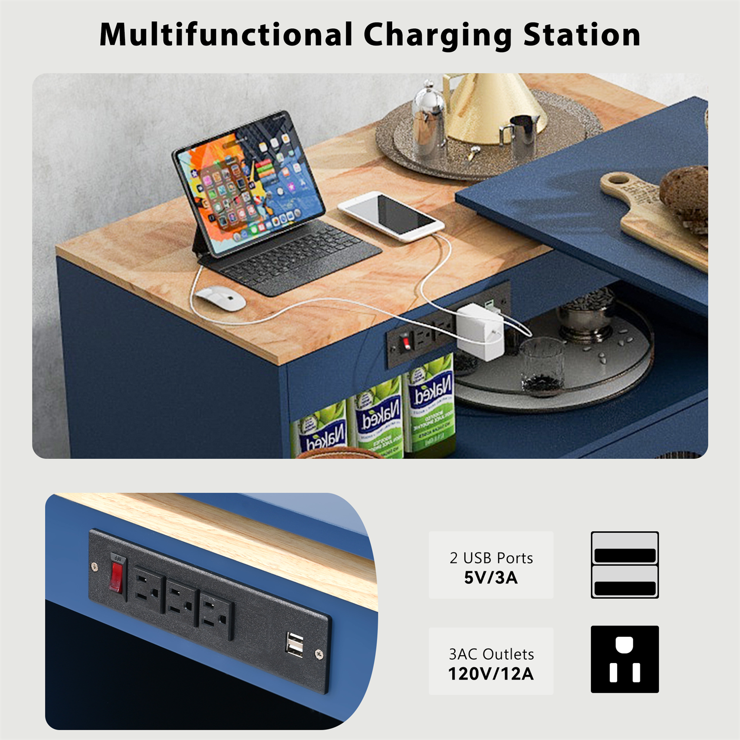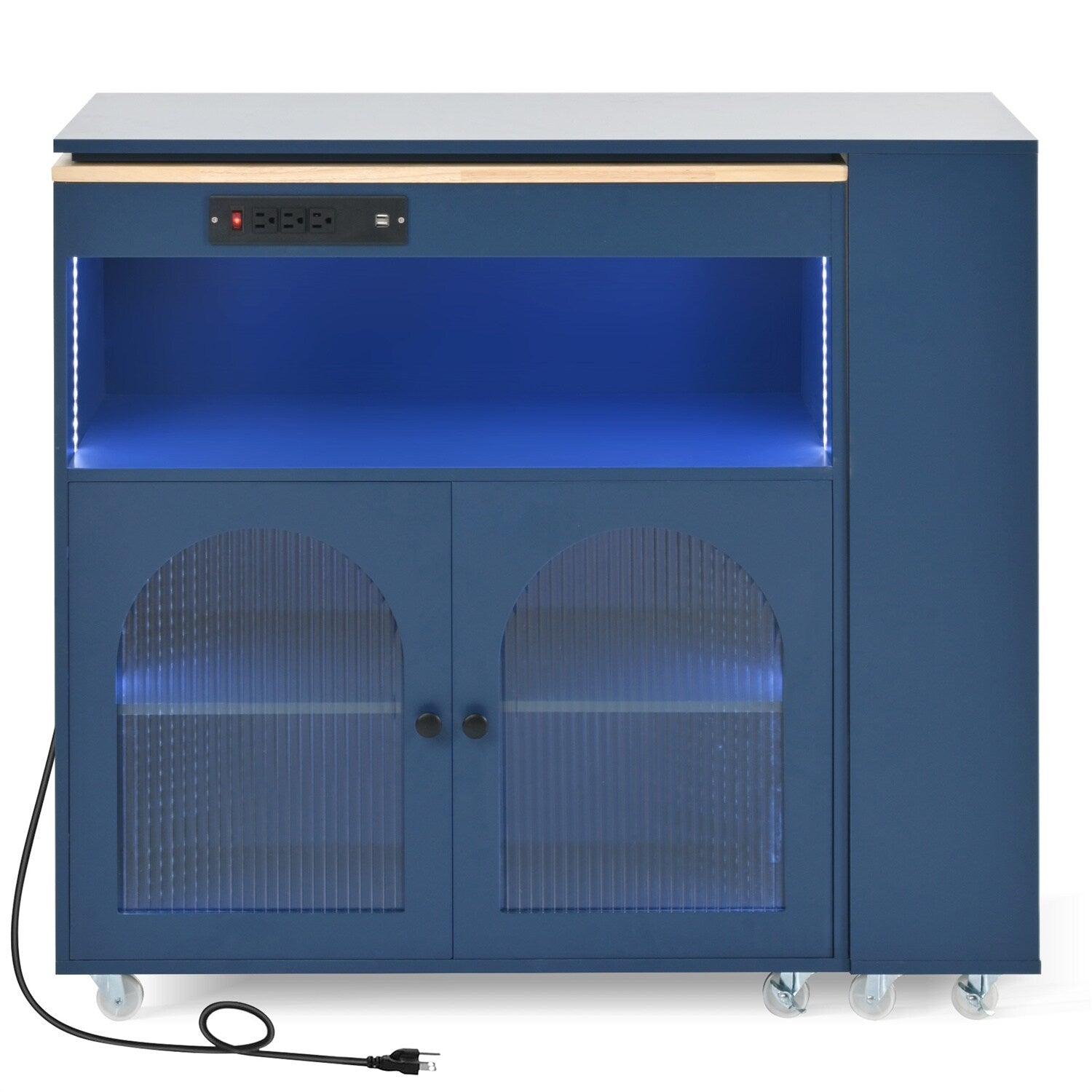 Transform your kitchen into a masterpiece of modern design with the BABOOM Blue MDF & Wood Rolling Kitchen Island. Its navy blue base and lustrous wood top create a stunning visual contrast that captures the eye, while fluted glass doors with LED lighting inject a dash of chic sophistication. Envision it not just as a functional workspace but as a versatile anchor for hosting and entertaining; pair it with sleek bar stools to create a cozy breakfast nook. This kitchen island becomes the essential centerpiece, effortlessly blending form and function for luxurious everyday living.