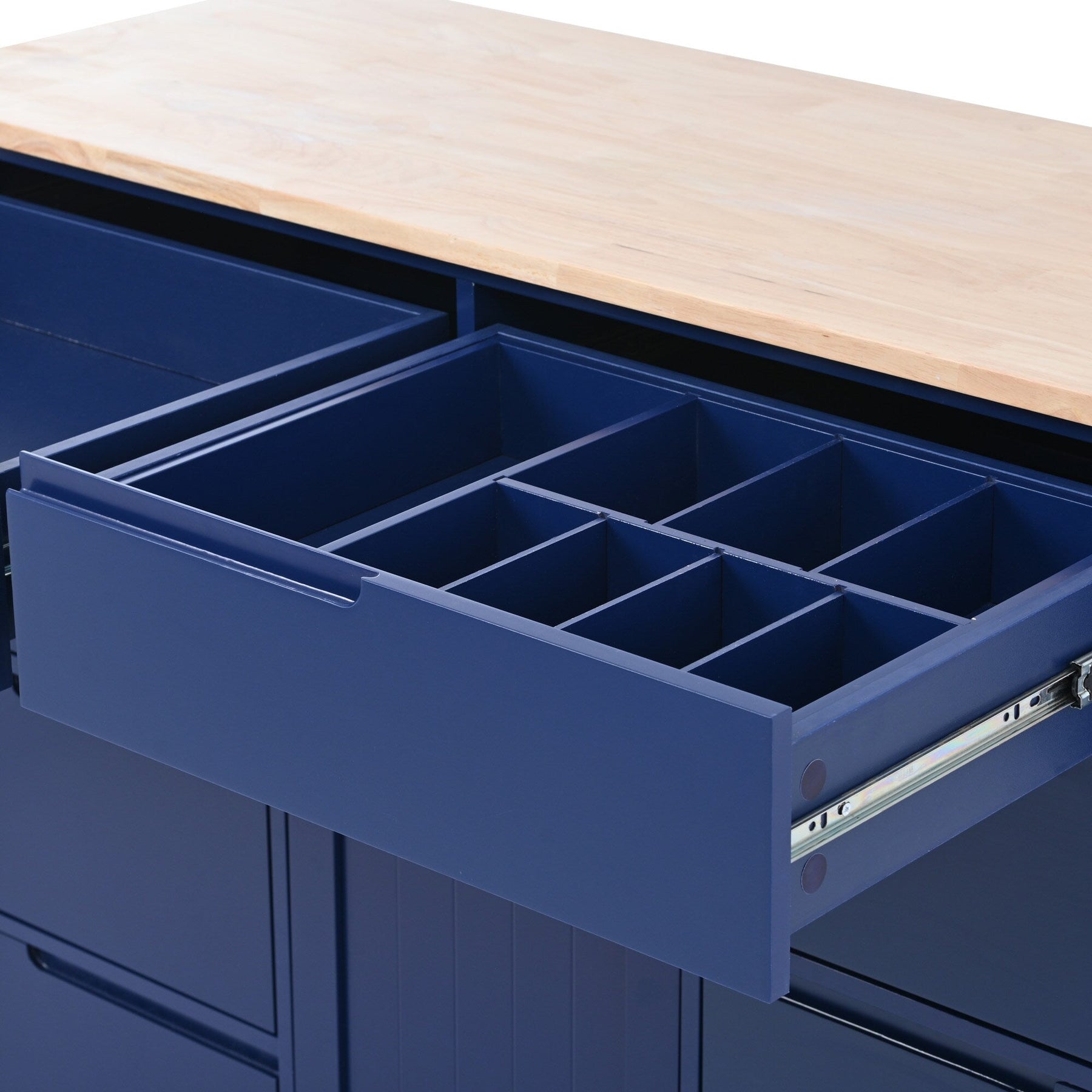 The BABOOM Blue Rolling Kitchen Island combines style with utility, featuring a striking blue MDF base and a warm rubberwood top. This mobile kitchen solution offers generous storage with eight drawers and a spacious cabinet, ideal for organizing your culinary essentials while adding a touch of contemporary flair to your cooking space.