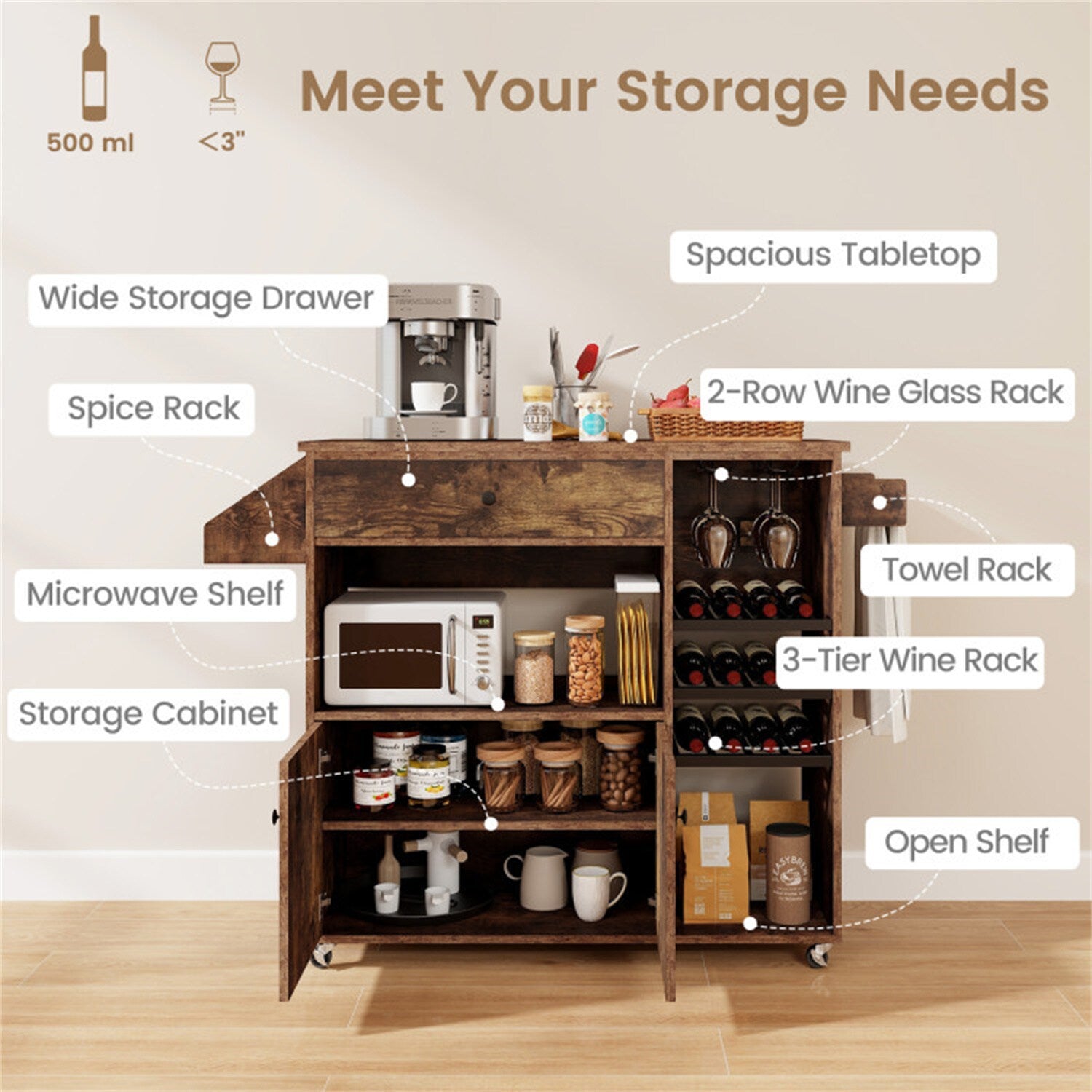 • Ample Storage: Includes drawer, adjustable shelf, wine and spice racks, and towel bar.