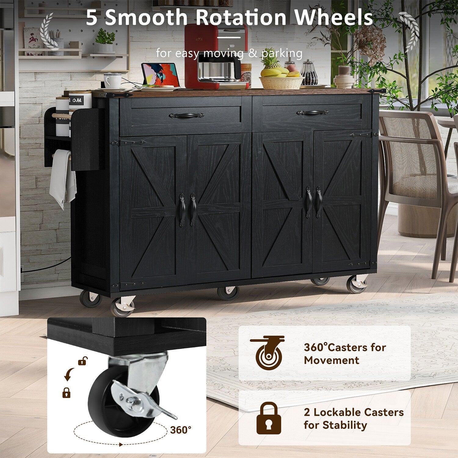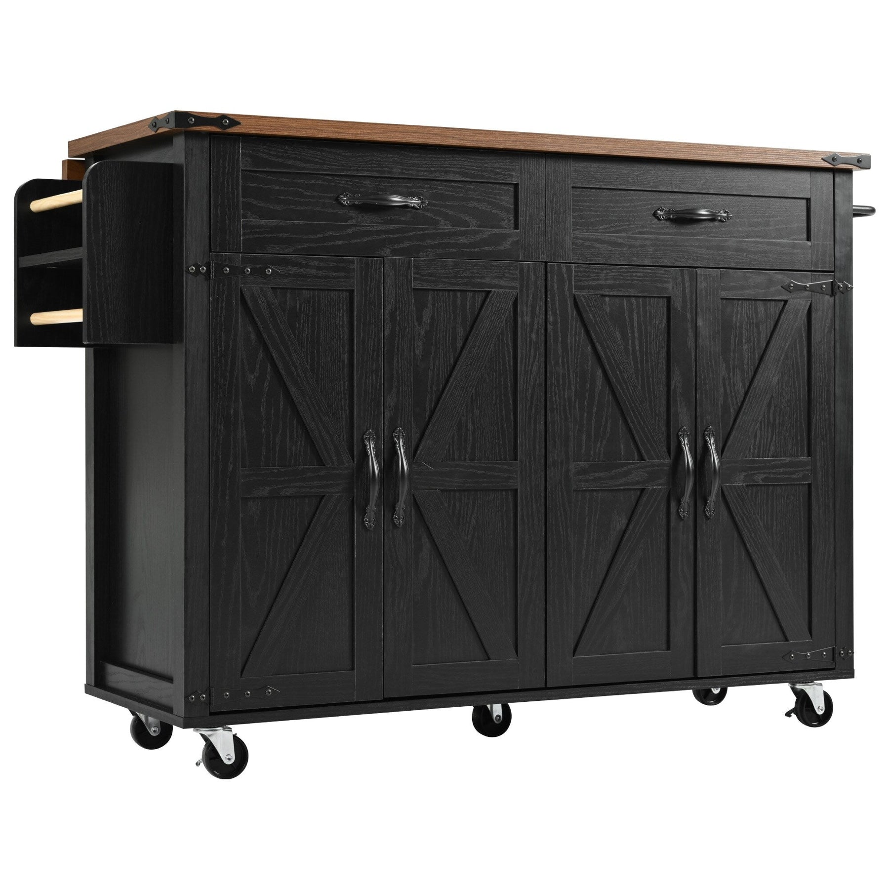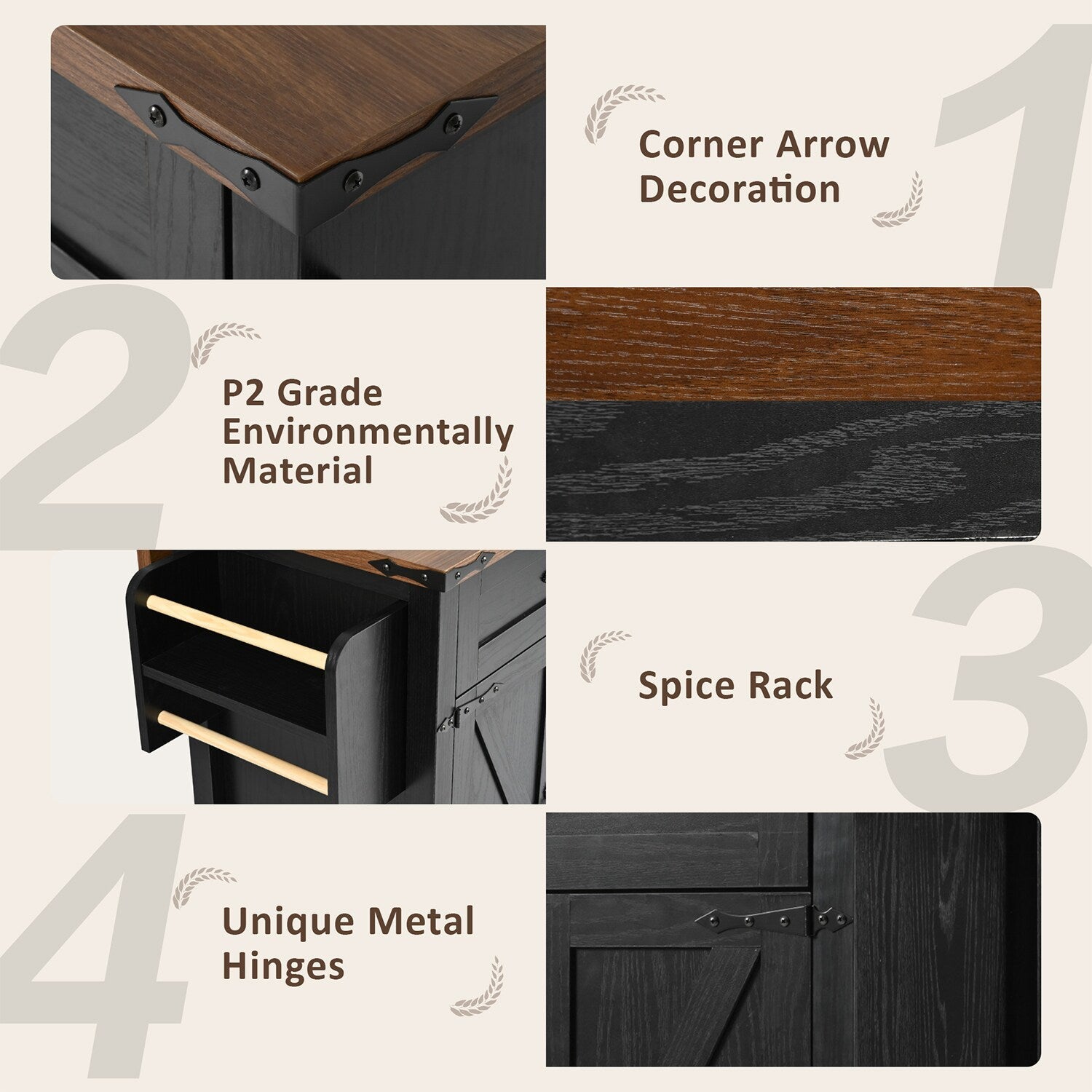 Upgrade your kitchen with the Bybafun Rolling Kitchen Island, a farmhouse-inspired centerpiece that combines rustic charm with modern functionality. Featuring a black MDF base and top, it provides generous storage space and a stylish look, perfect for enhancing any kitchen or living area.