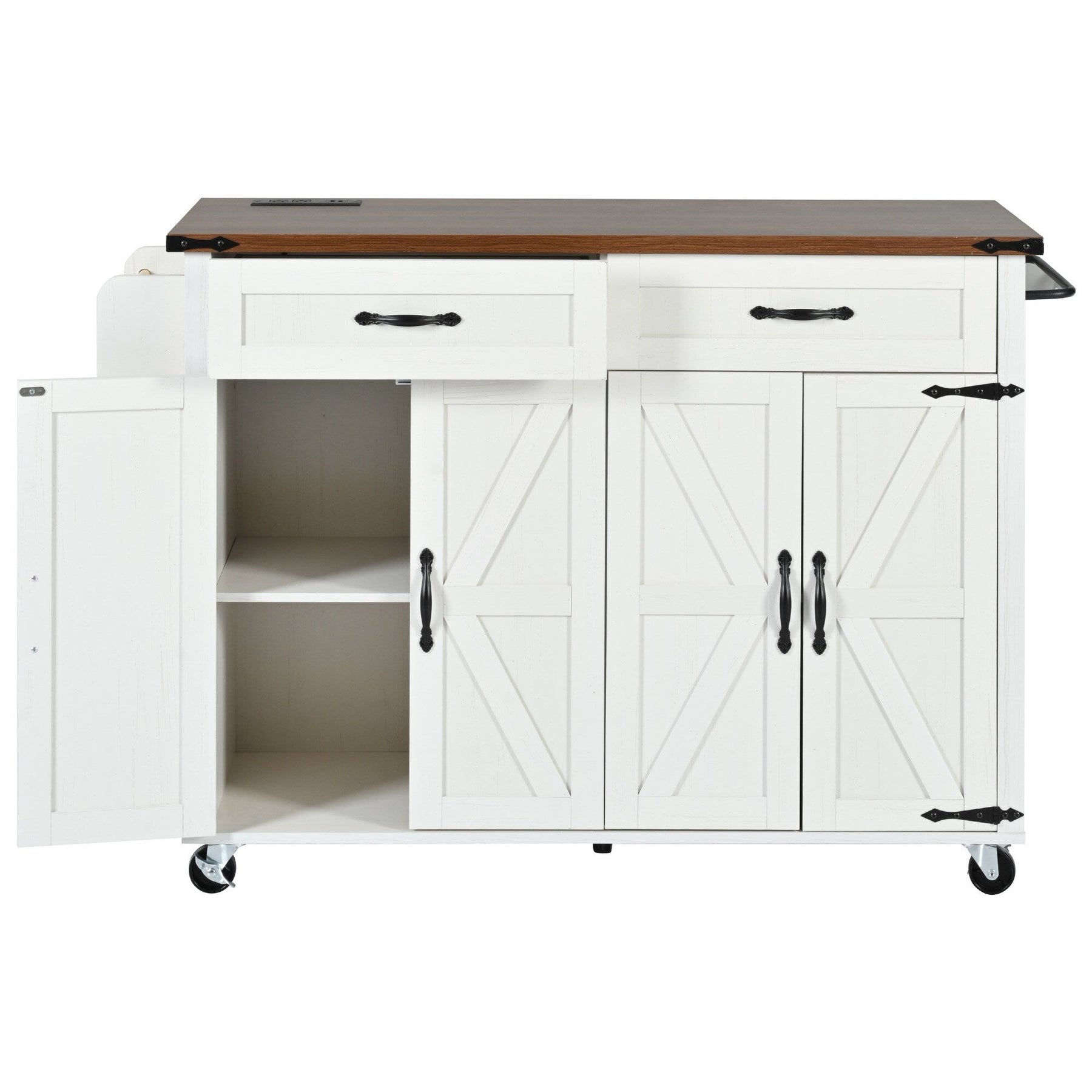 Transform your kitchen space with the Bybafun White MDF Rolling Kitchen Island, combining rustic elegance and modern functionality. Featuring a sleek, farmhouse-inspired design with a distressed finish and metal accents, this island not only adds aesthetic charm but also enhances your cooking experience with its spacious storage and convenient built-in charging station.