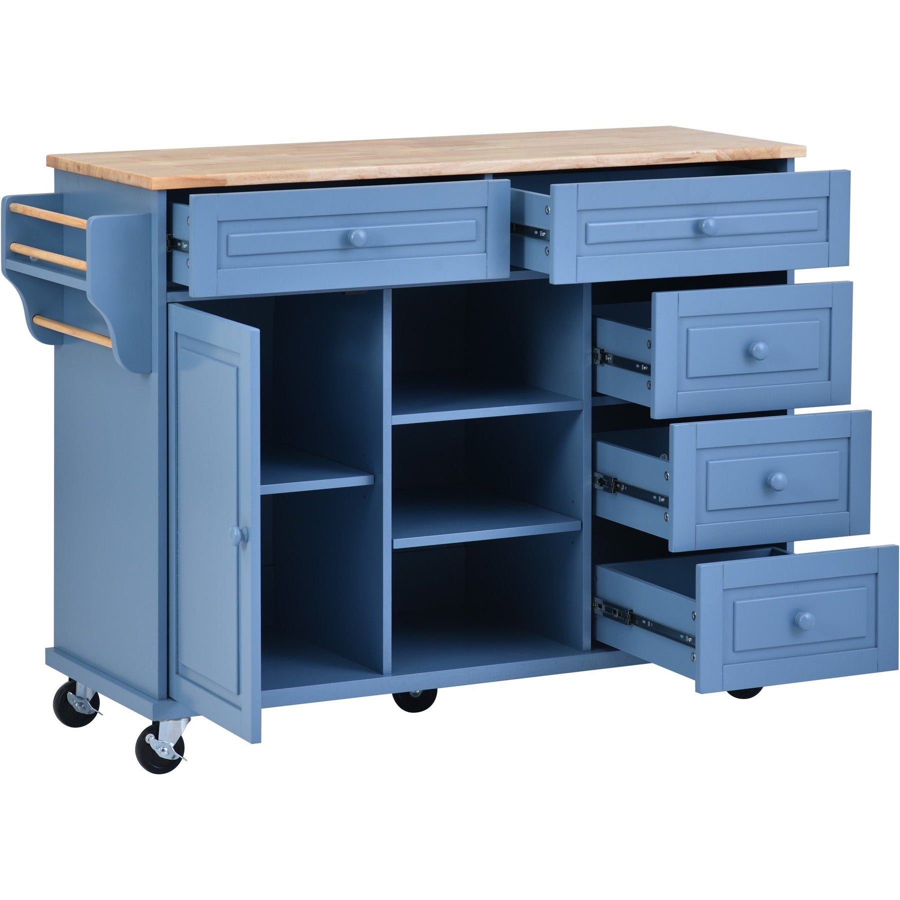 Transform your kitchen with the versatile and stylish CESICIA Blue Wood Base with Wood Top Rolling Kitchen Island. Crafted from eco-friendly MDF and rubberwood, this mobile island provides a durable workspace and ample storage, enhancing both functionality and aesthetic appeal in your home.