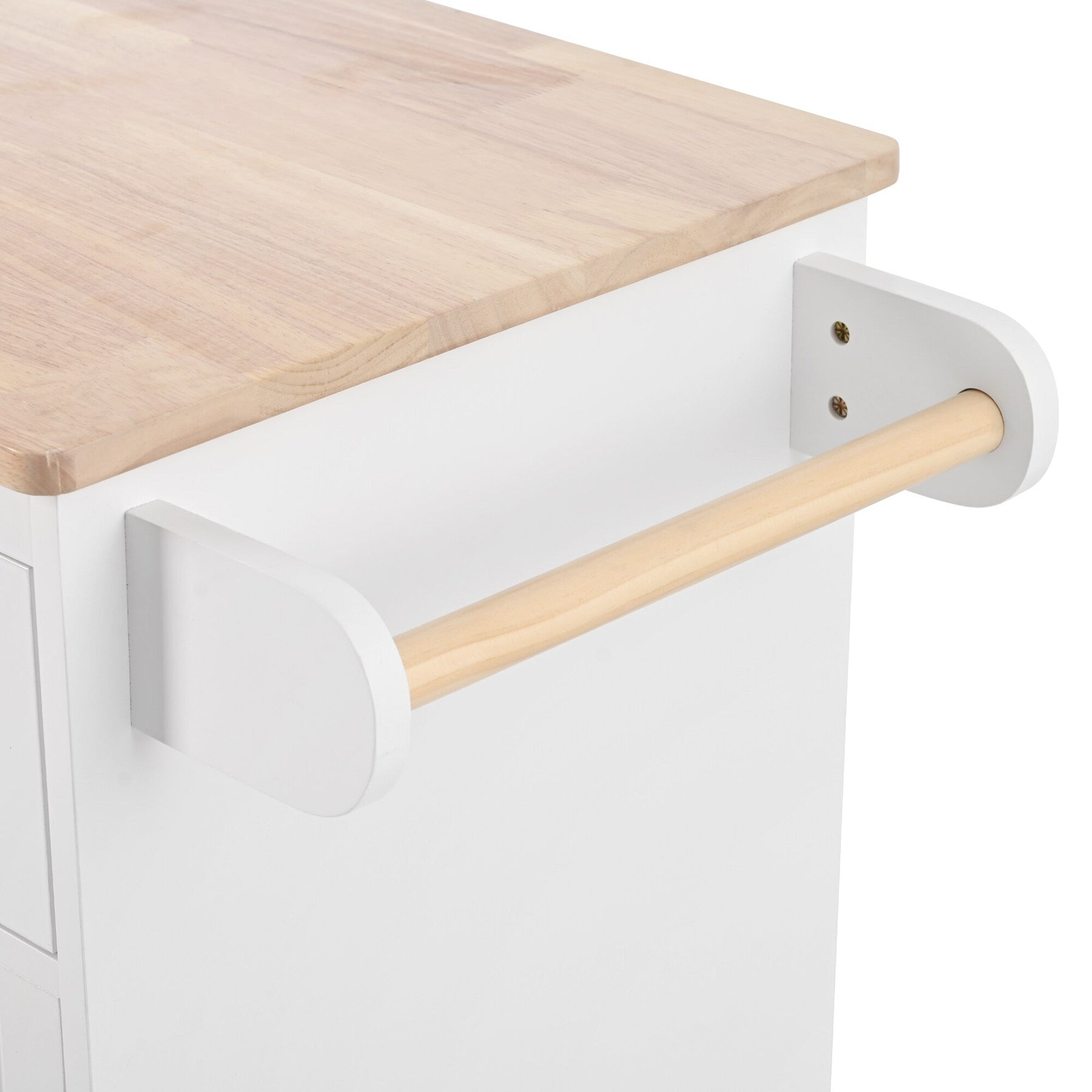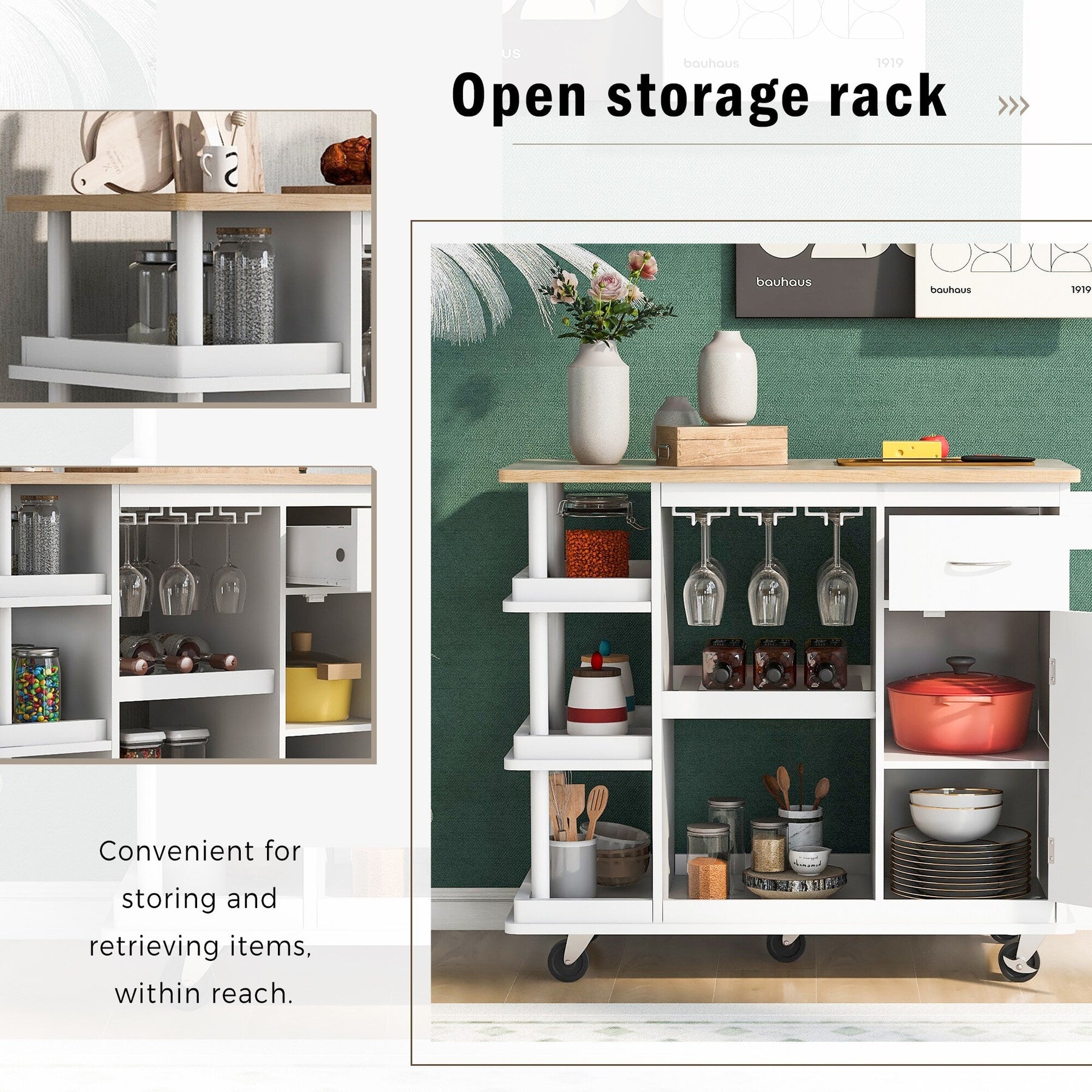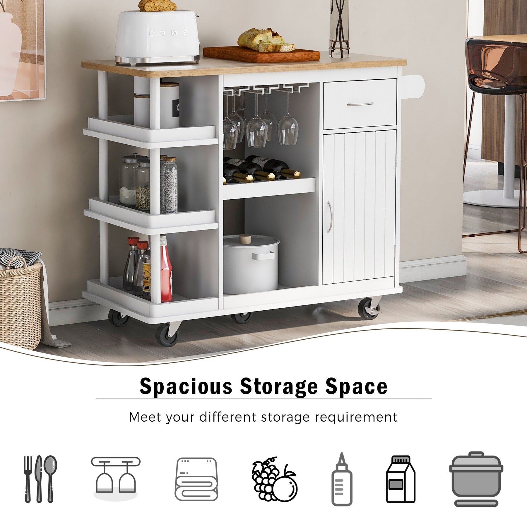 Enhance your kitchen's efficiency and style with this white wood base rolling kitchen island, seamlessly combining functionality and aesthetic appeal. Featuring a spacious wood top and adjustable shelves, it's the quintessential helper for your culinary adventures, offering ample storage options including a dedicated wine rack.