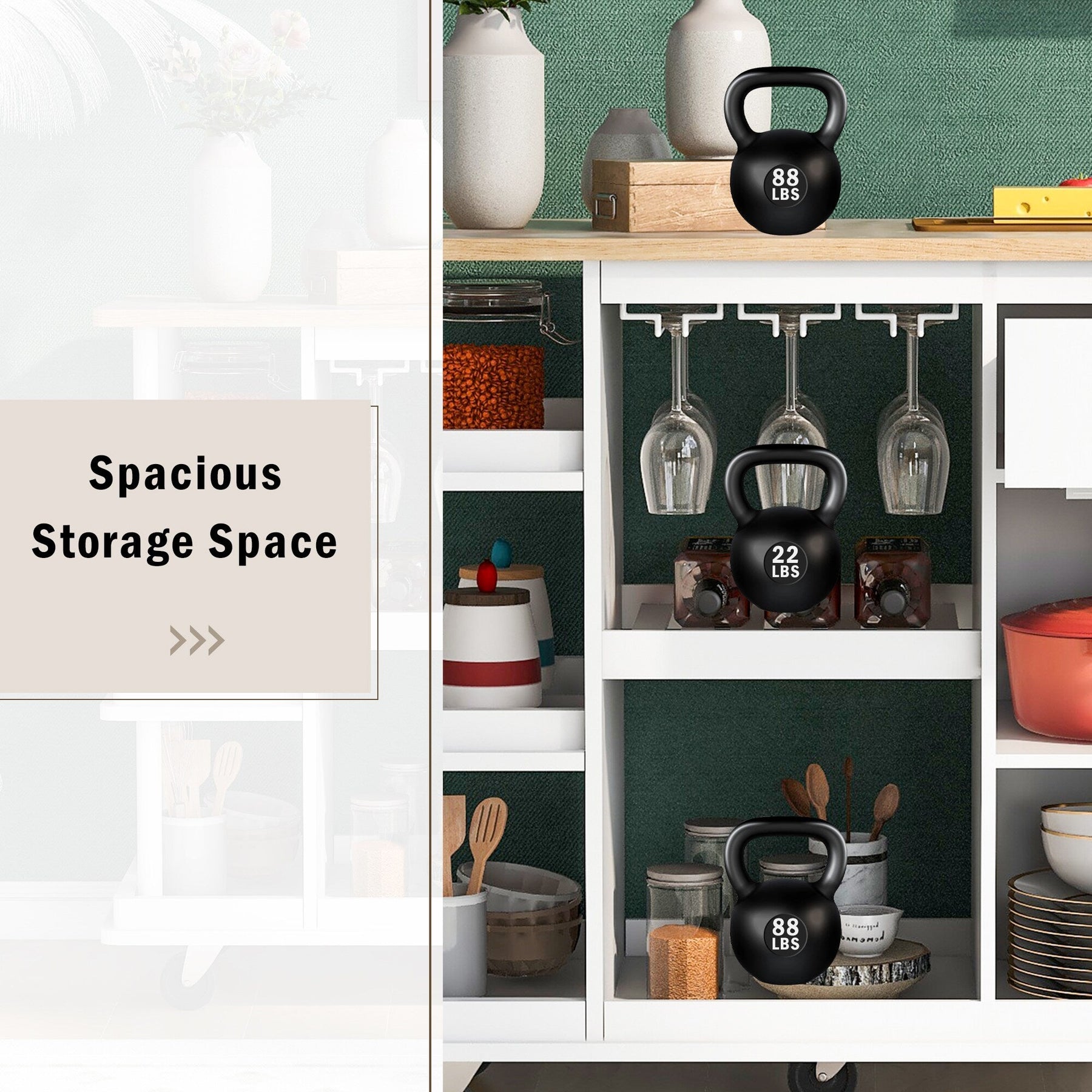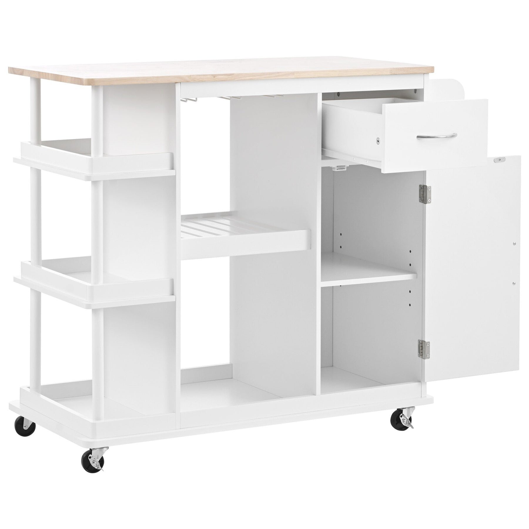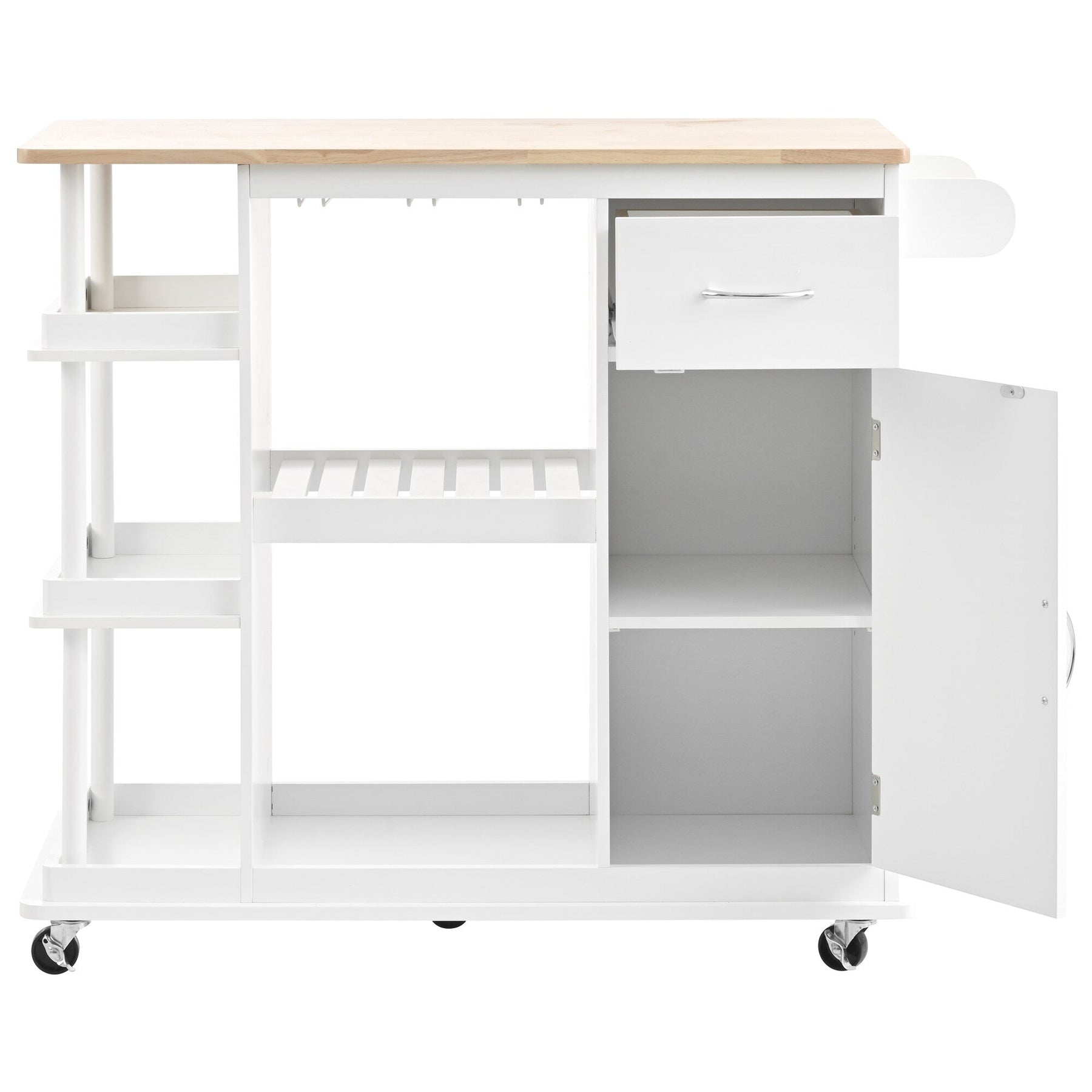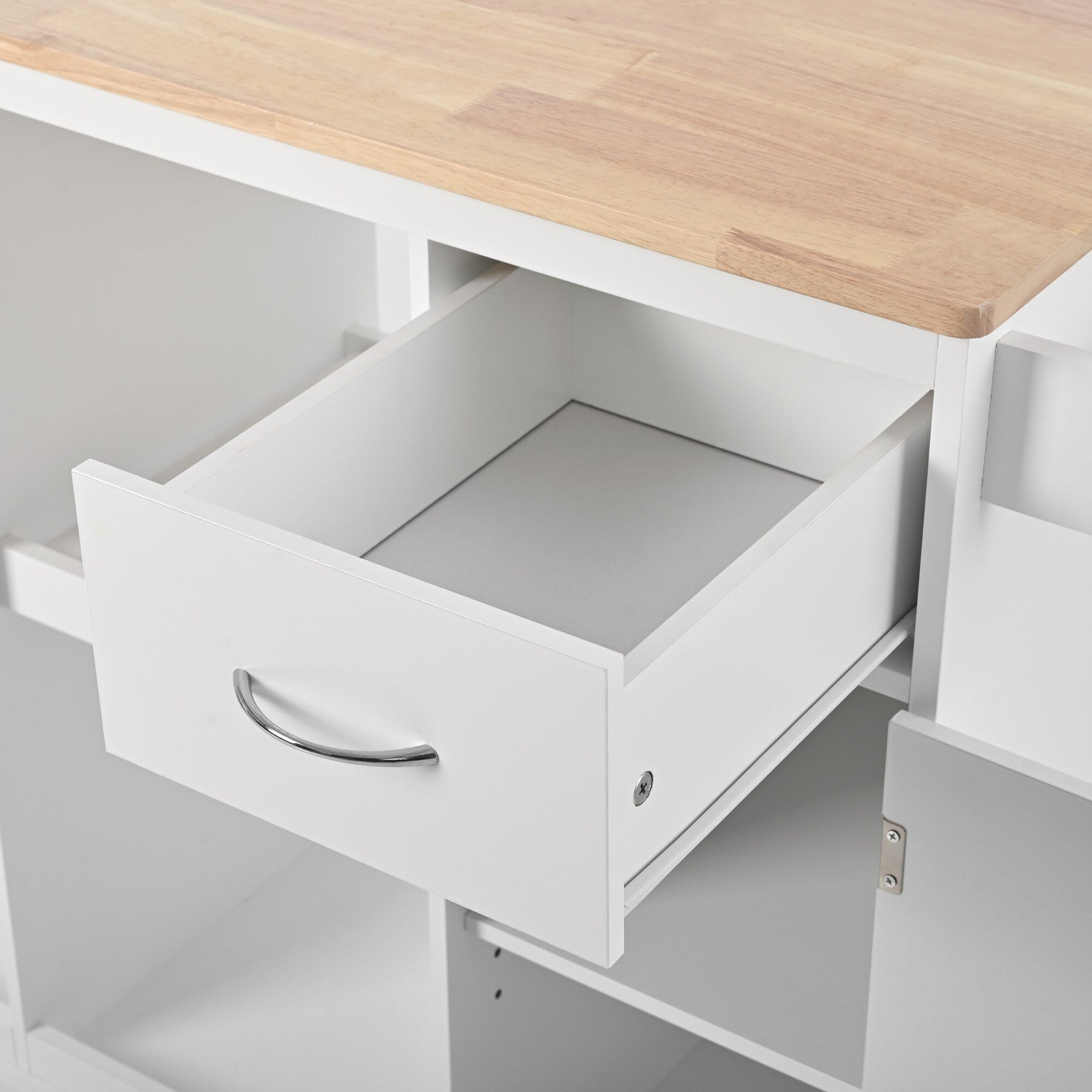 Enhance your kitchen's efficiency and style with this white wood base rolling kitchen island, seamlessly combining functionality and aesthetic appeal. Featuring a spacious wood top and adjustable shelves, it's the quintessential helper for your culinary adventures, offering ample storage options including a dedicated wine rack.