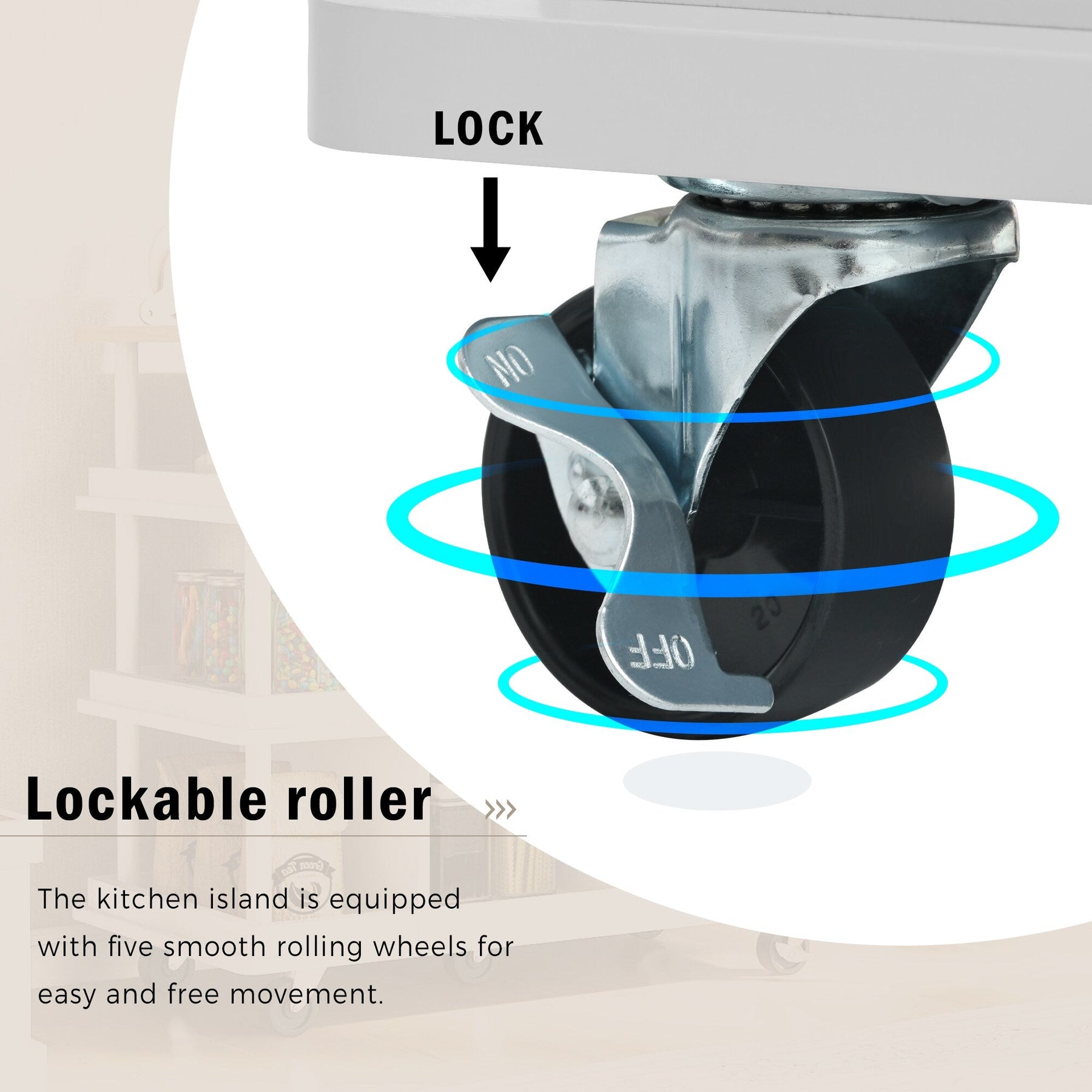 A: The kitchen island features five smooth rolling wheels, making it easy to move around your space whenever needed.