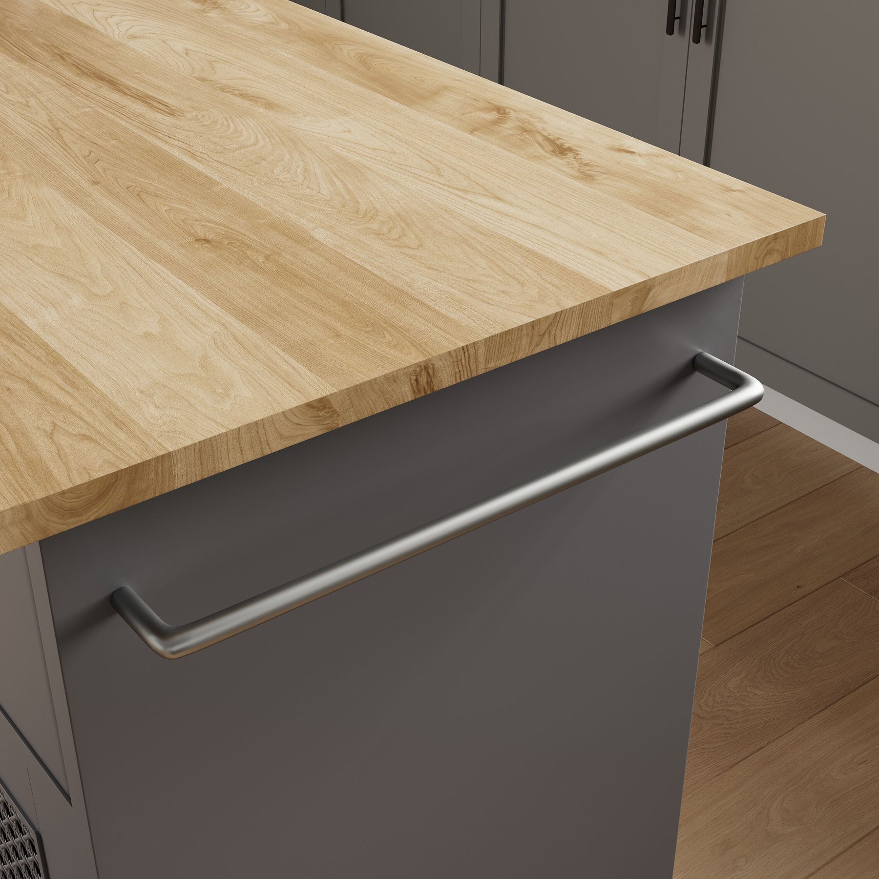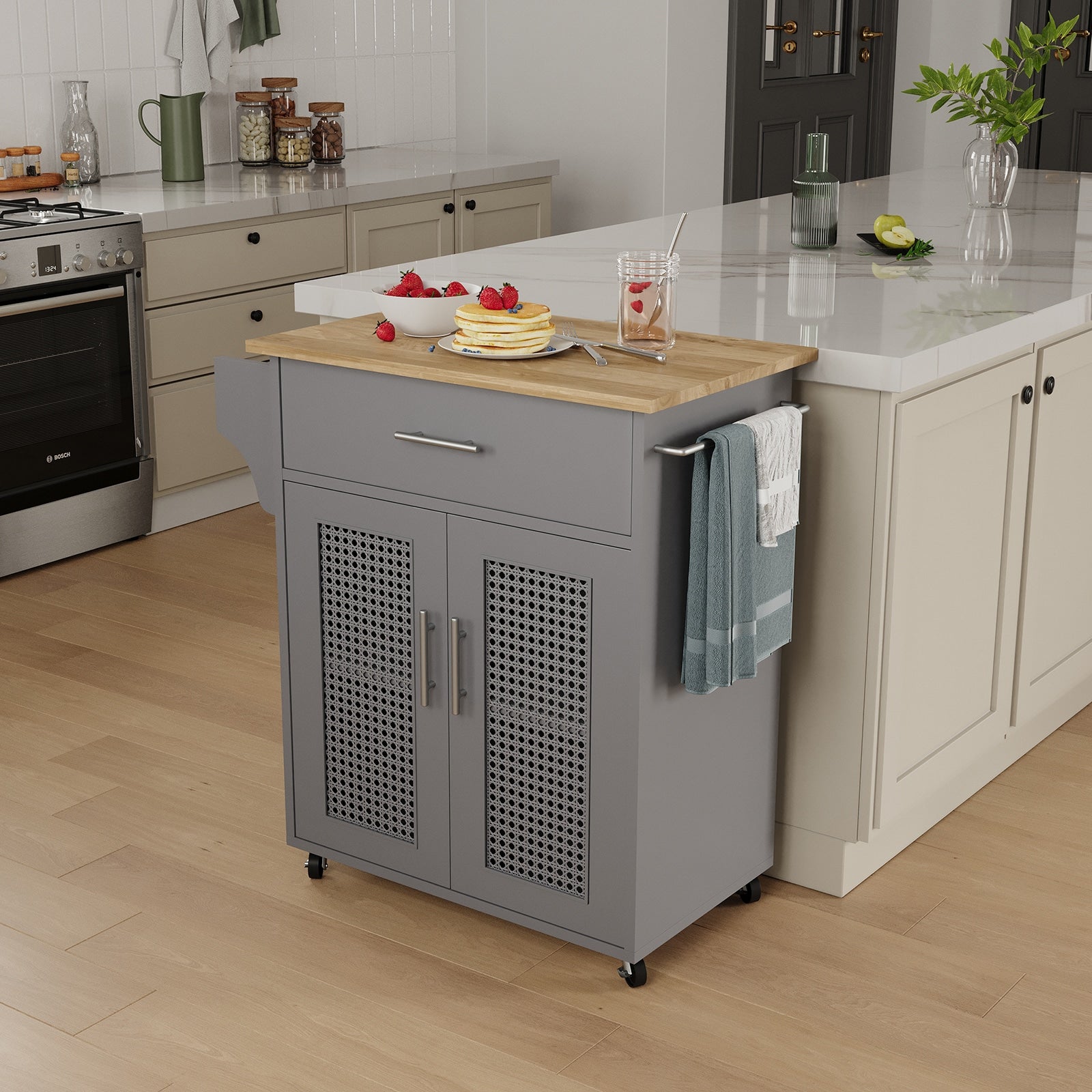Elevate your kitchen's functionality with the Jarenie Rolling Kitchen Island, featuring a stylish gray MDF base and wood top. This medium-sized island offers versatile storage solutions with cabinet and drawer space, complemented by smooth-rolling wheels for effortless maneuverability.