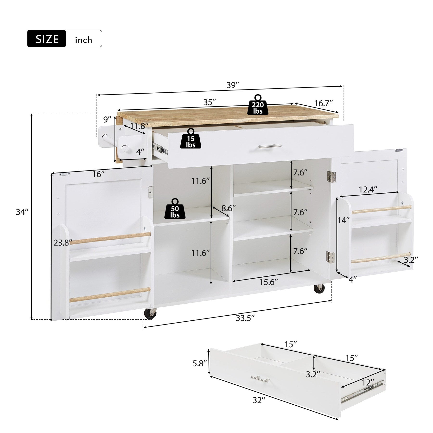 Enhance your kitchen space with the Kahomvis Rolling Kitchen Island, featuring a stylish white MDF base and a drop leaf wood top that's perfect for compact spaces. The sturdy rubberwood tabletop combines functionality with elegance, while the innovative internal storage racks effortlessly organize your essentials, making it an ideal addition to any home.