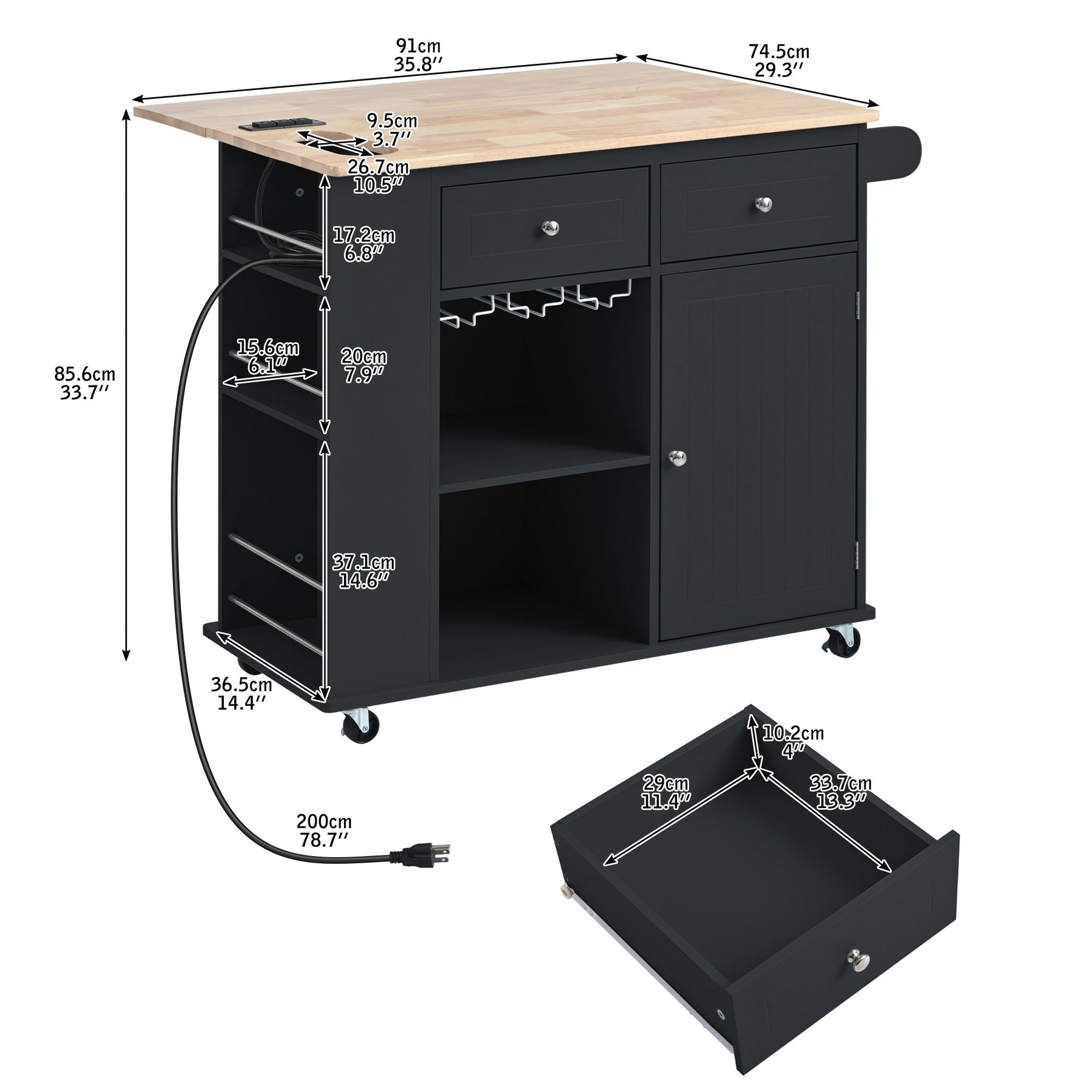 Elevate your kitchen with the Miki Shinly Black MDF Rolling Kitchen Island, featuring a versatile drop-leaf design and integrated power outlet. This contemporary kitchen island combines style and functionality, offering ample storage, open shelving, and a wine rack to enhance your culinary space efficiently.