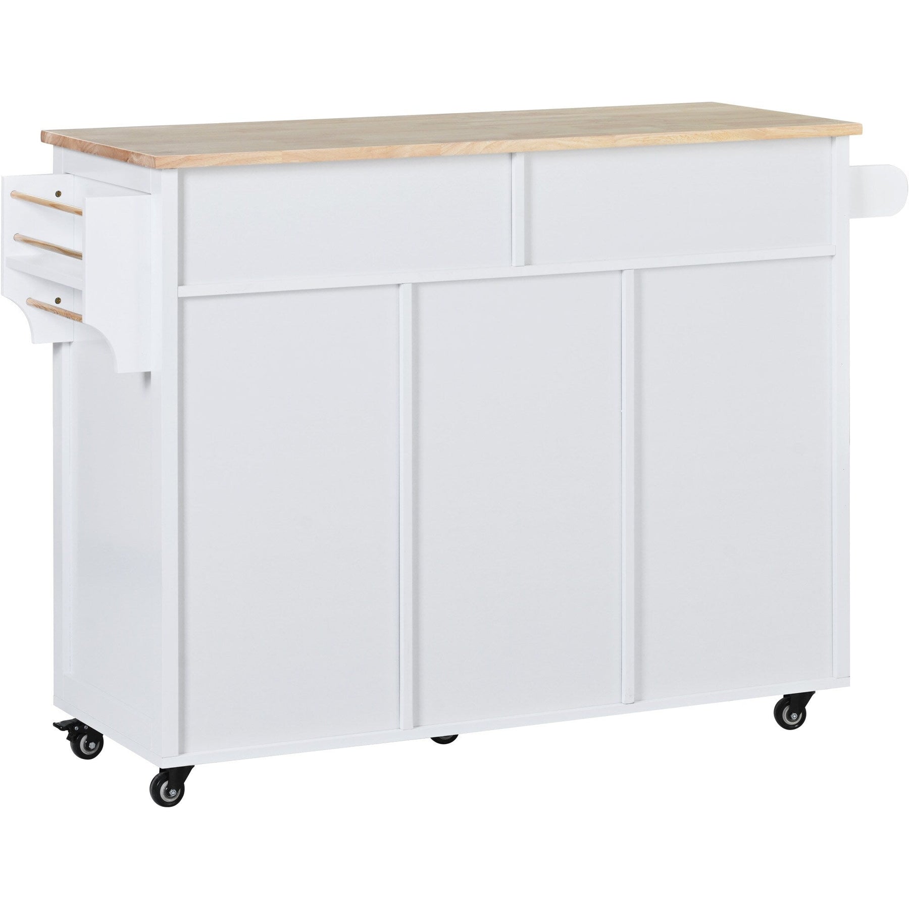 Enhance your kitchen's functionality with this versatile rolling kitchen island, featuring a pristine white MDF base and a durable rubber wood top. Designed with eight handle-free drawers for streamlined storage and mobility that makes rearranging your space a breeze, this island is a practical addition to any kitchen setup.