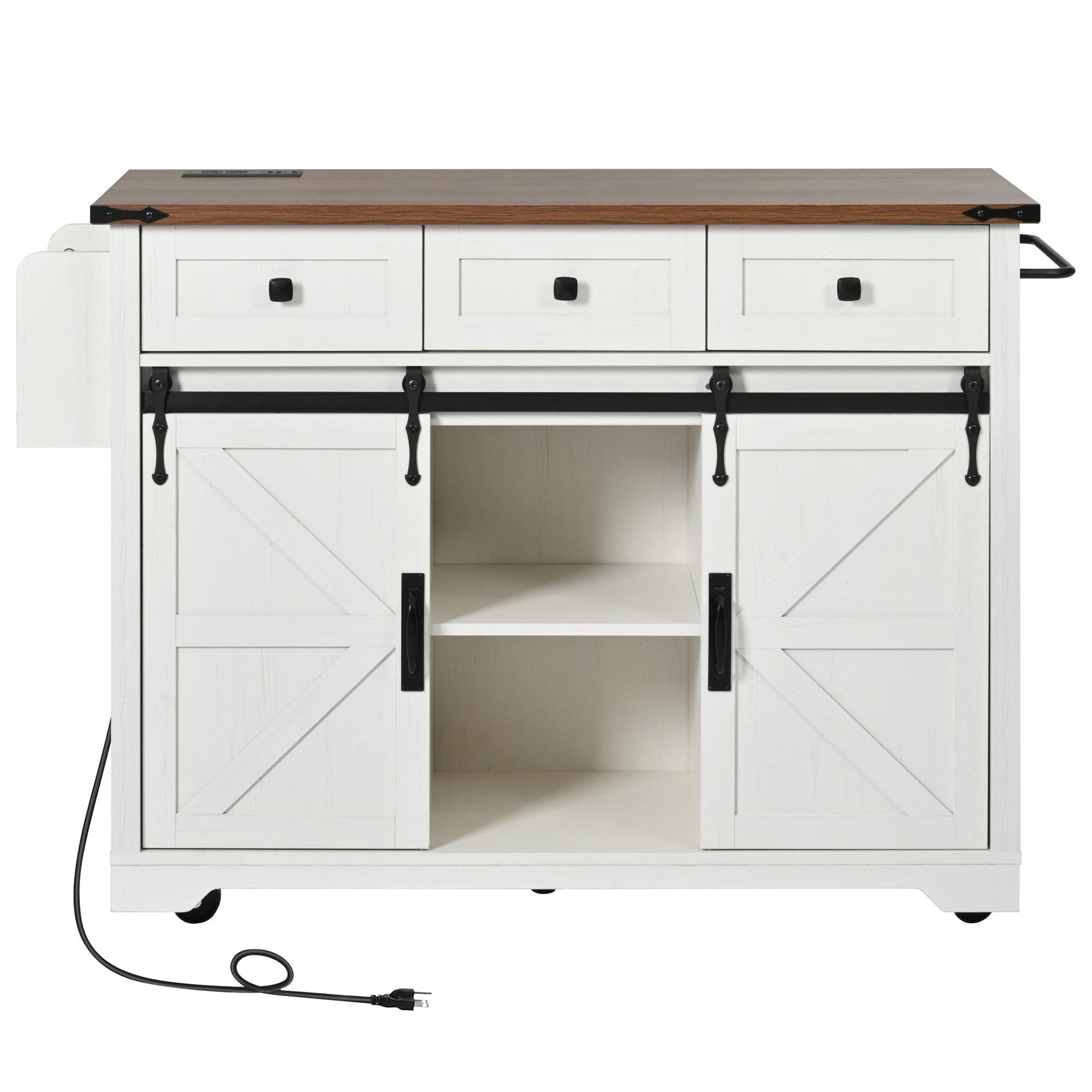 Transform your kitchen with the SINOFURN Farmhouse Rolling Kitchen Island, which combines rustic charm with modern functionality. Featuring MDF wood tops and a chic white base, this island offers ample storage, customizable shelving, and a built-in charging station to streamline your culinary space.
