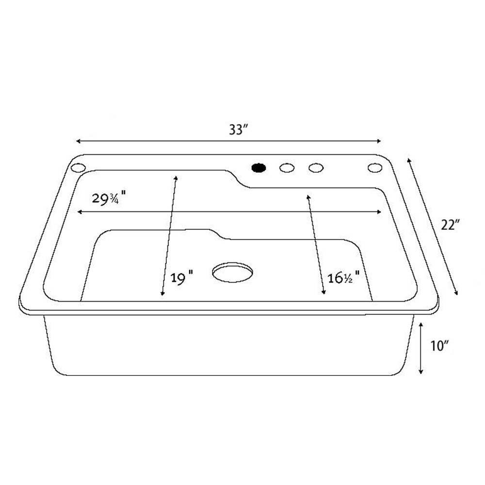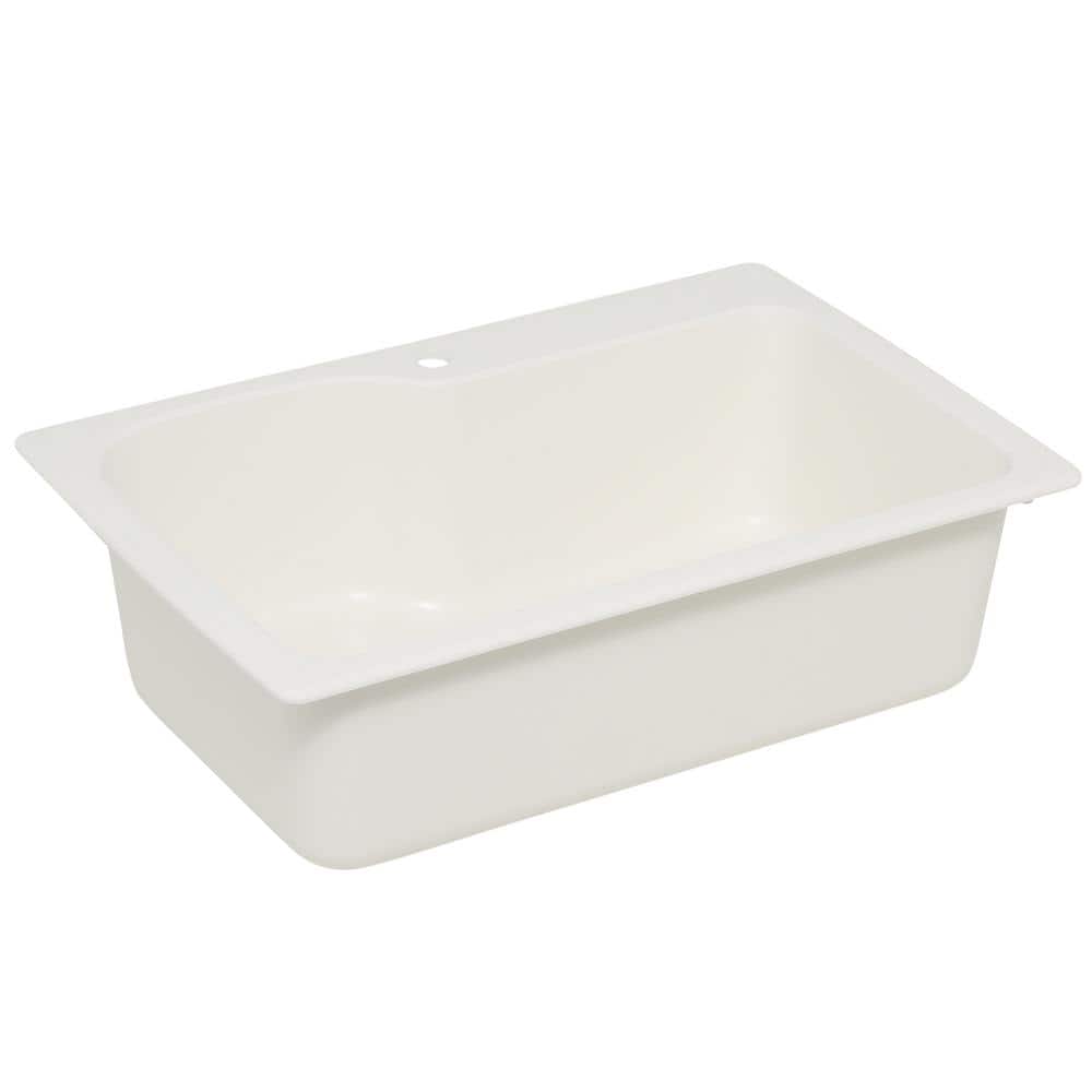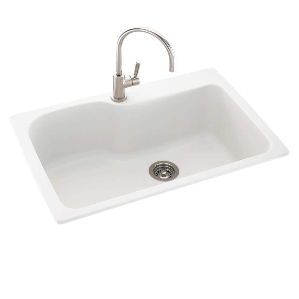 Durable solid-surface single-bowl kitchen sink designed for drop-in or undermount installation. The 33 in. wide matte-white basin resists heat, stains, impacts, and scratches, with a right-side drain and one predrilled faucet hole plus additional drillouts.