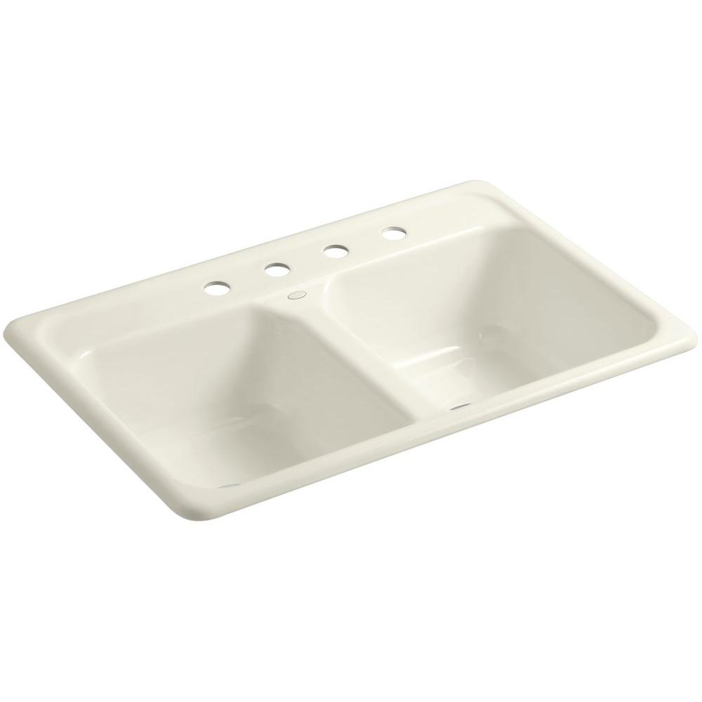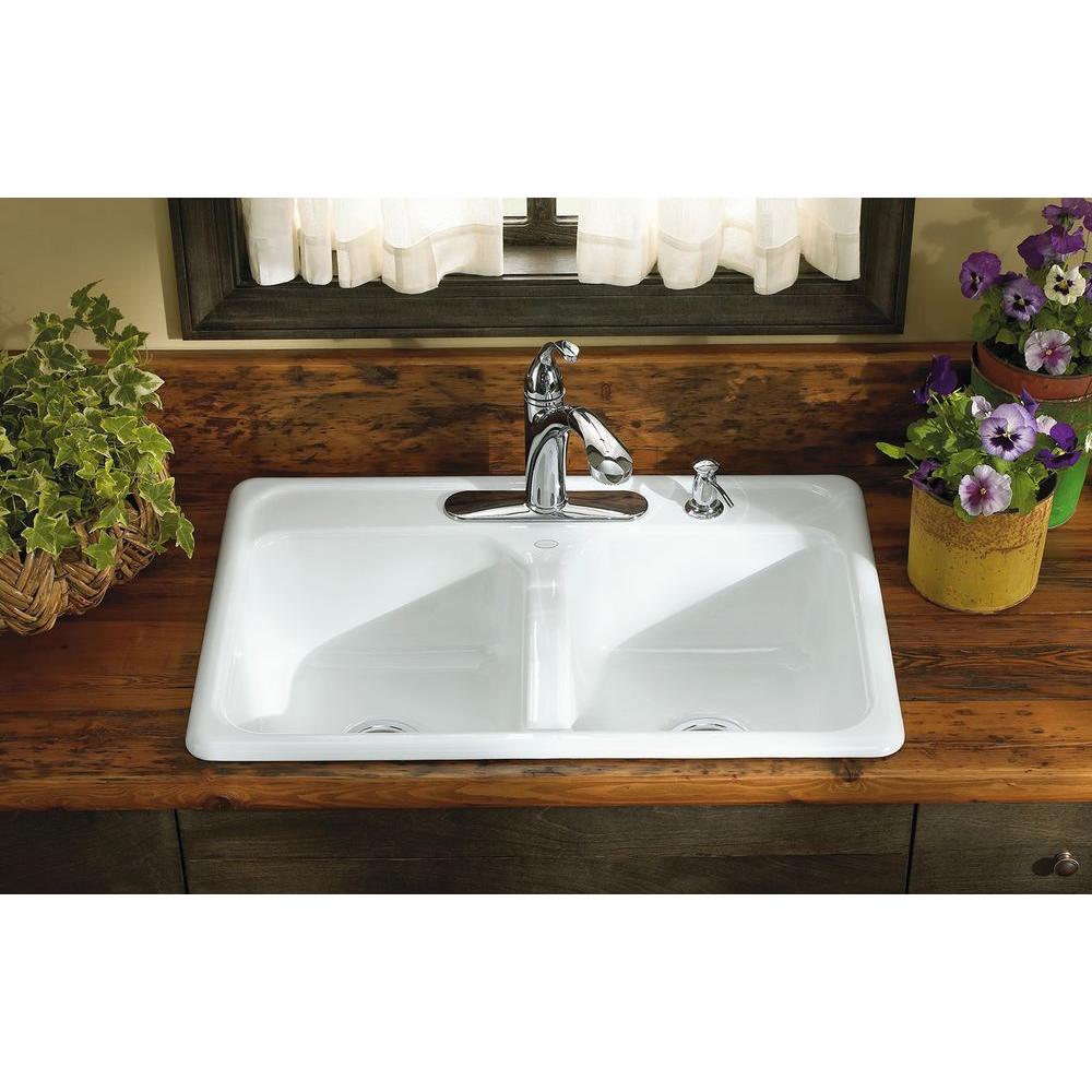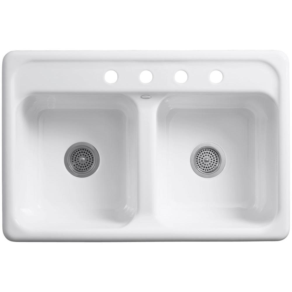 Delafield Drop-In Cast Iron 33 in. 4-Hole Double Bowl Kitchen Sink in White