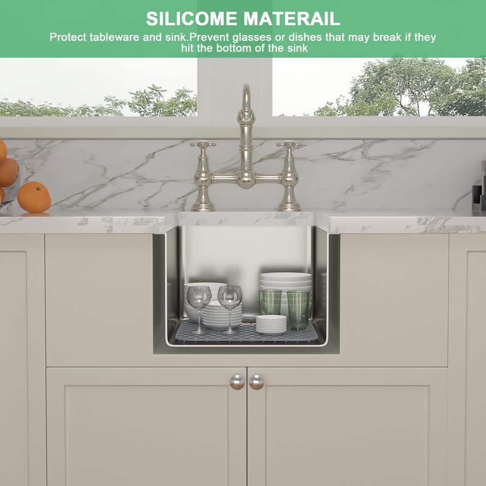 Transform your kitchen's utility area with this sleek, silicone sink protector in elegant gray. The supple material gracefully contours to your sink while providing a robust shield against scratches and damage. Use it creatively as a stylish drying mat that turns everyday dishware protection into an art form. This essential kitchen tool offers not just functionality but a touch of luxury to your daily clean-up routines.