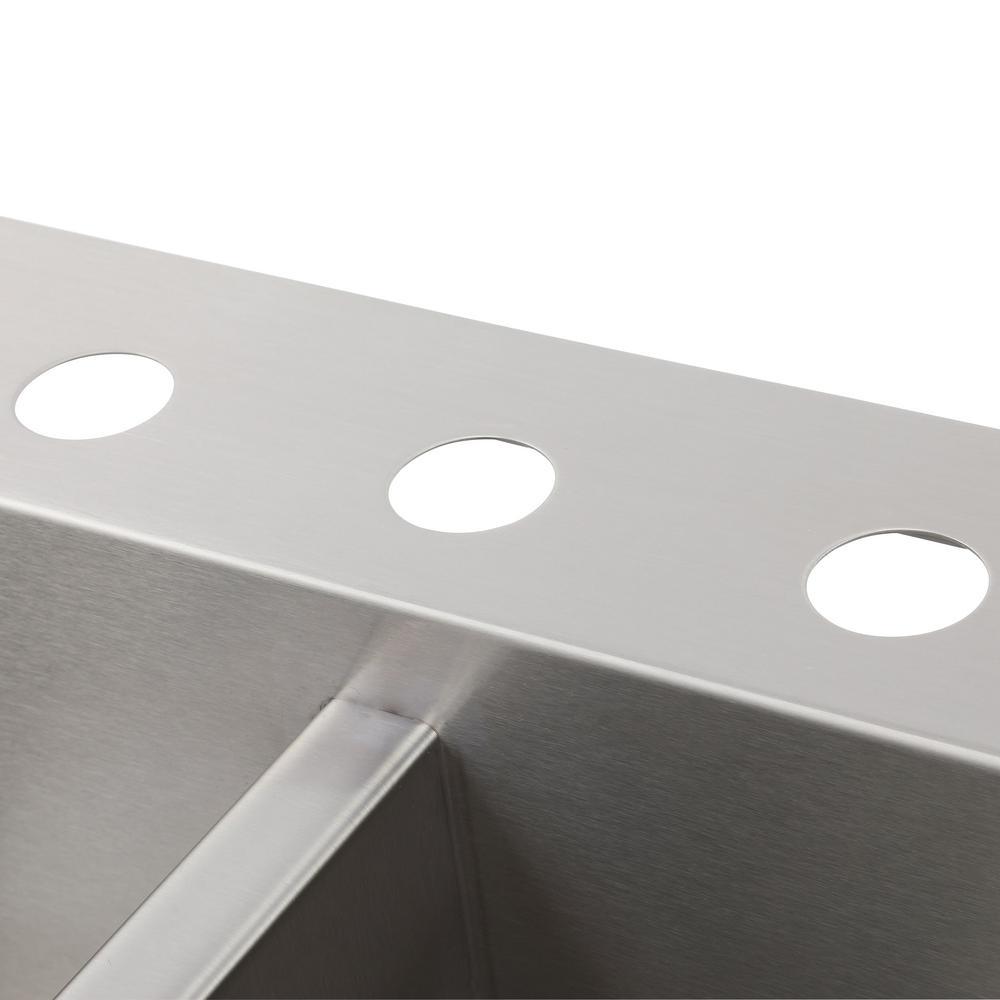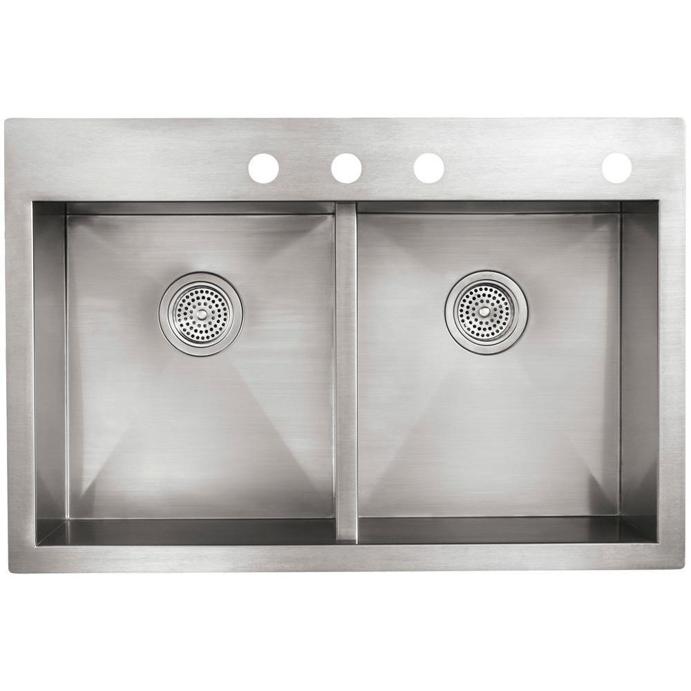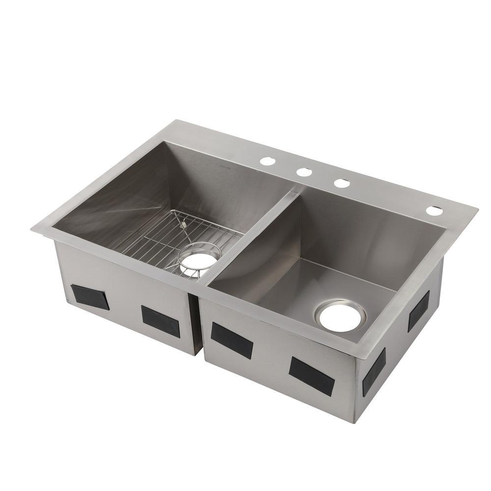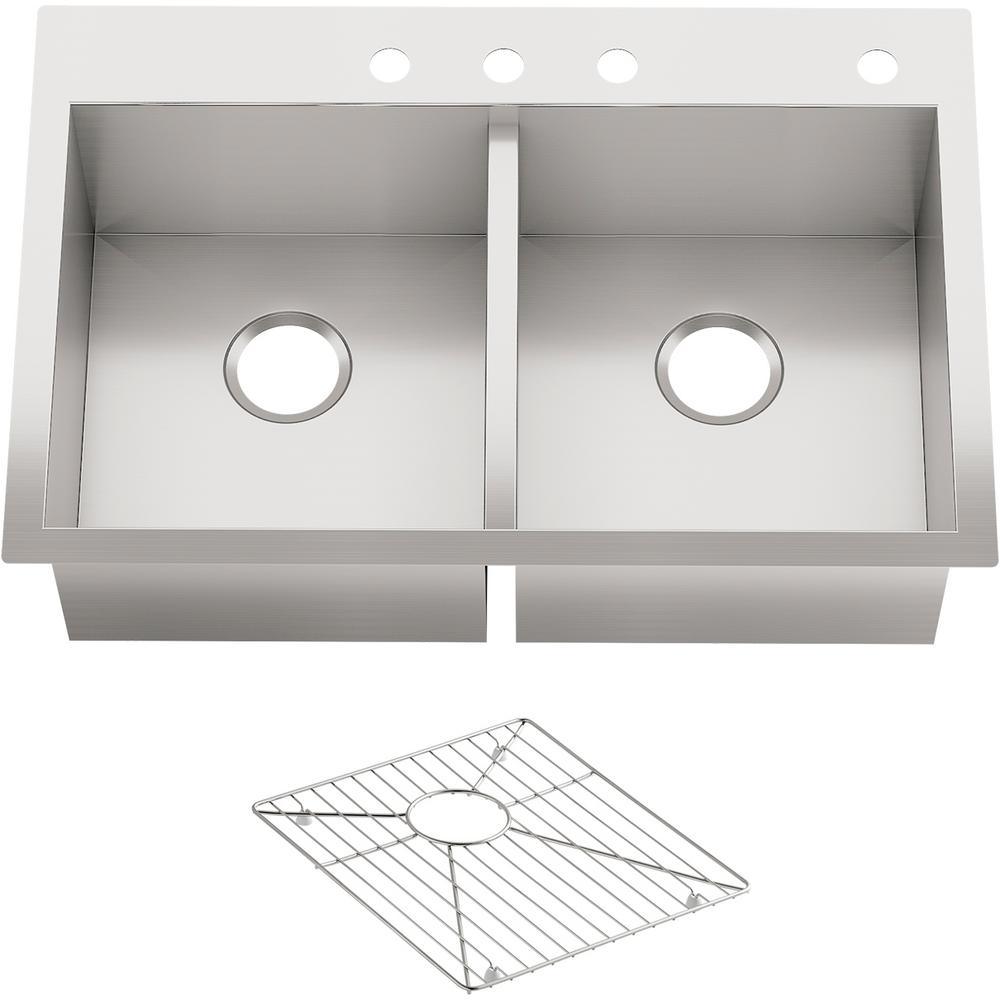 Vault Dual Mount Stainless Steel 33 in. 4-Hole Double Bowl Kitchen Sink with Basin Rack