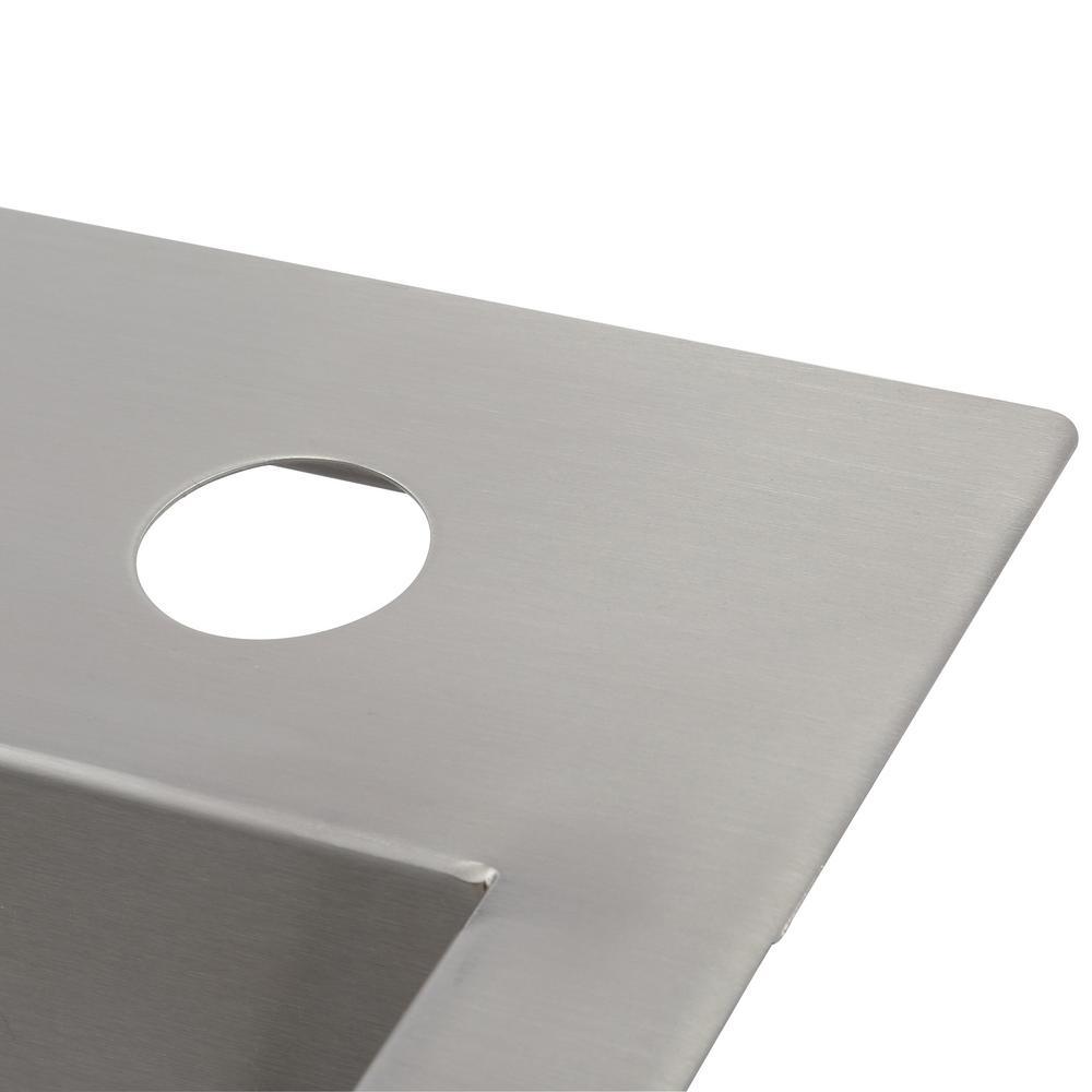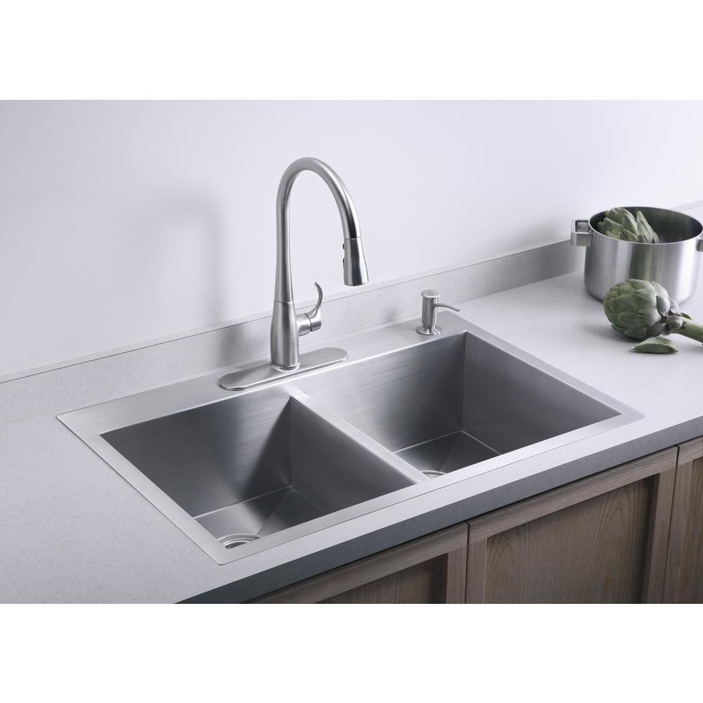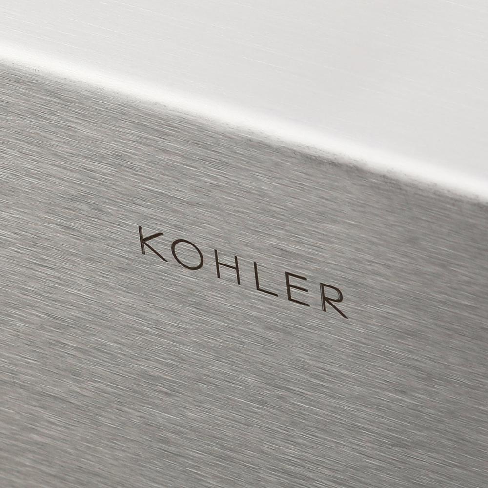 The distinctive, modern design of the Vault sink lends a contemporary vibe to your kitchen. Handcrafted from durable stainless steel, this dual mount sink features a lowered divider, tightly angled corners to maximize basin space, and a sloped bottom that helps with draining and cleanup. An engineered sound-absorption system significantly reduces disposal and dishwashing noise. Vault's ultra-flat rim makes it easy to wipe from the counter directly into the sink.