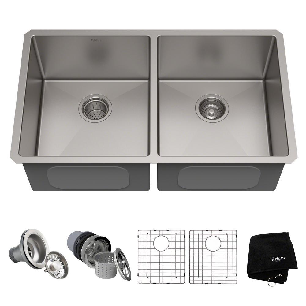 • Free accessories: Multi-functional dish grids (x2) protect the bottom of the sink, 3 piece basket strainer set, drain assembly with strainer, premium KRAUS kitchen towel