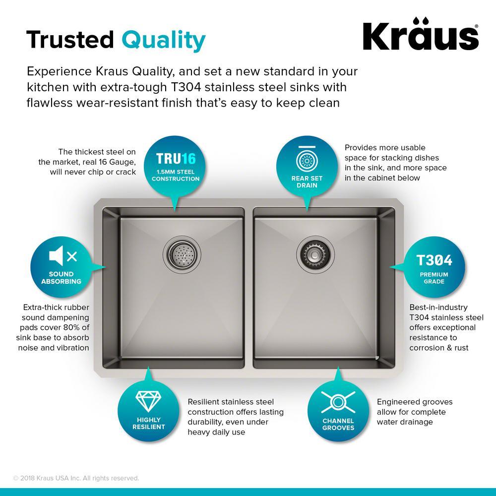 KRAUS kitchen sinks are known for excellent quality and sturdy construction. The Premier Collection sinks are the perfect combination of quality, durability and convenience. Made from durable T-304 stainless steel, this undermount sink can easily stand up to constant use and handle your toughest kitchen tasks. Enjoy the advantage of high-end kitchen sinks with the best-selling Standard PRO Series. This KRAUS sink features a clean contemporary design and wear-resistant finish with a beautiful sheen that complements most kitchen appliances.