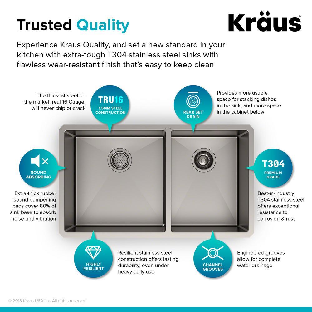 KRAUS kitchen sinks are known for excellent quality and sturdy construction. The Premier Collection sinks are the perfect combination of quality, durability and convenience. Made from durable T-304 stainless steel, this undermount sink can easily stand up to constant use and handle your toughest kitchen tasks. Enjoy the advantage of high-end kitchen sinks with the best-selling Standard PRO Series. This KRAUS sink features a clean contemporary design and wear-resistant finish with a beautiful sheen that complements most kitchen appliances.