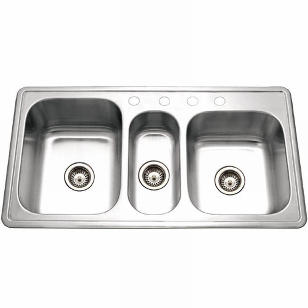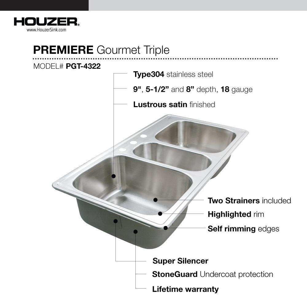 The Premiere Gourmet Top Mount Stainless Steel 41.31x22 in. 4-Hole Triple Bowl Kitchen Sink features three distinct bowls, providing ample space for multi-tasking or letting dishes soak while washing other glasses. This product measures 41-5/16 in. by 22 in. Made of T-304 stainless steel, this sink will not rust or bend and protects against corrosion.